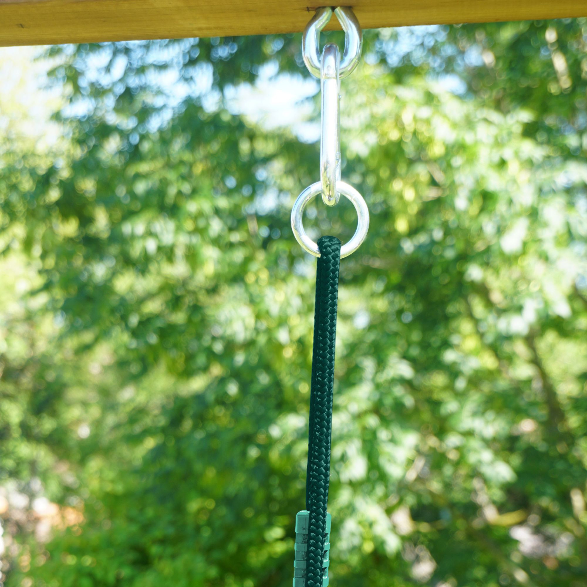 La balançoire pour enfant se monte facilement : il suffit d’accrocher les anneaux métalliques aux mousquetons. (non fournis)