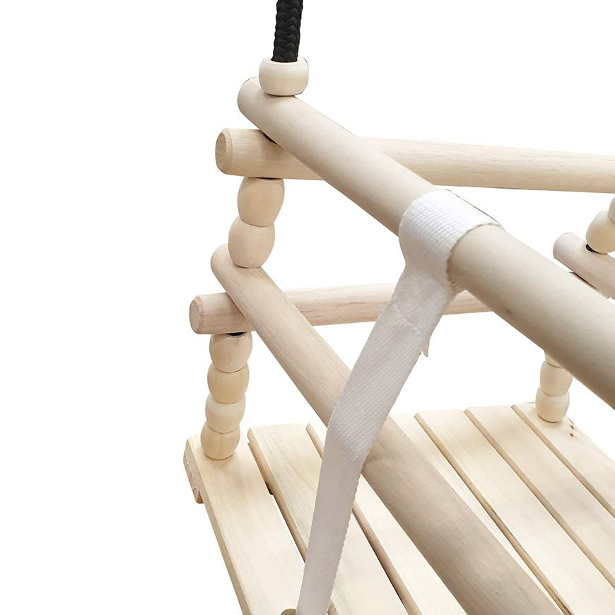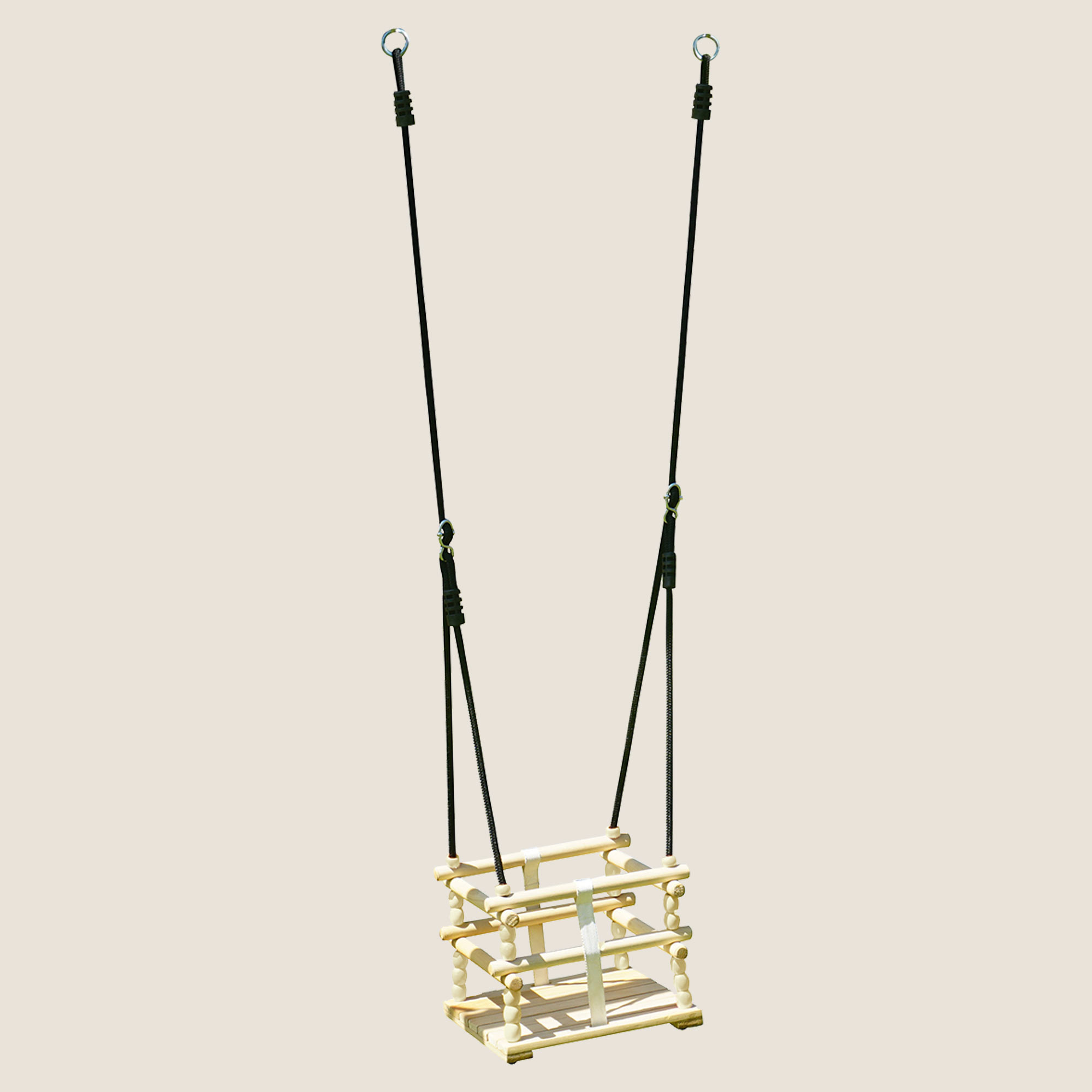 Cette balançoire bébé se monte très facilement en accrochant les anneaux métalliques aux mousquetons (non fournis). Une sangle de sécurité assure un maintien optimal de votre enfant. Les formes arrondies du siège garantissent confort et évitent tout risque de blessure.