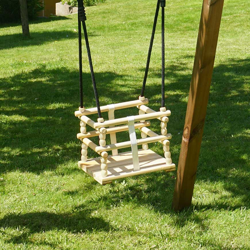 Le siège bébé OBJECTIF NATURE s’adapte aux portiques en bois de 1,95m à 2,35m de hauteur et peut supporter un poids maximum de 15kg.
