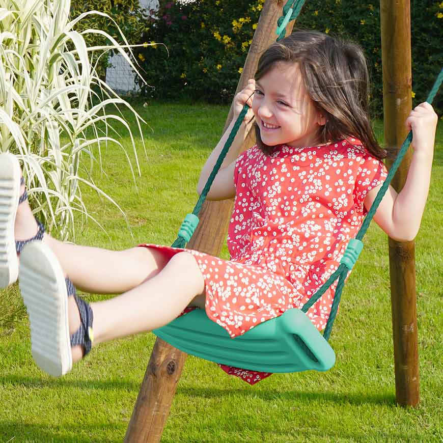 Le siège se fixe facilement à votre portique à l’aide de mousquetons en acier (non inclus, disponibles sur notre site). Deux coloris sont proposés pour s’accorder à votre jardin : vert foncé ou vert d’eau.