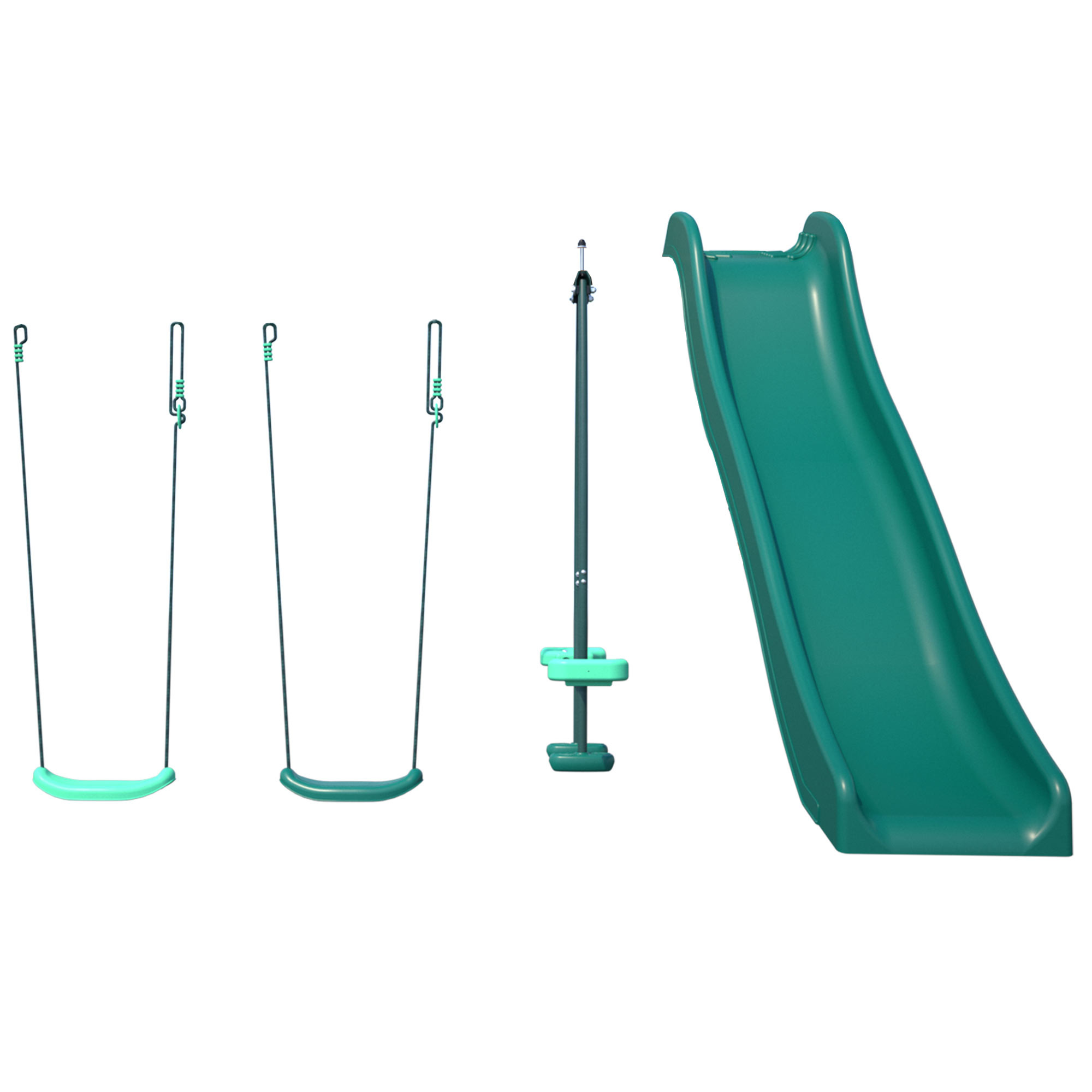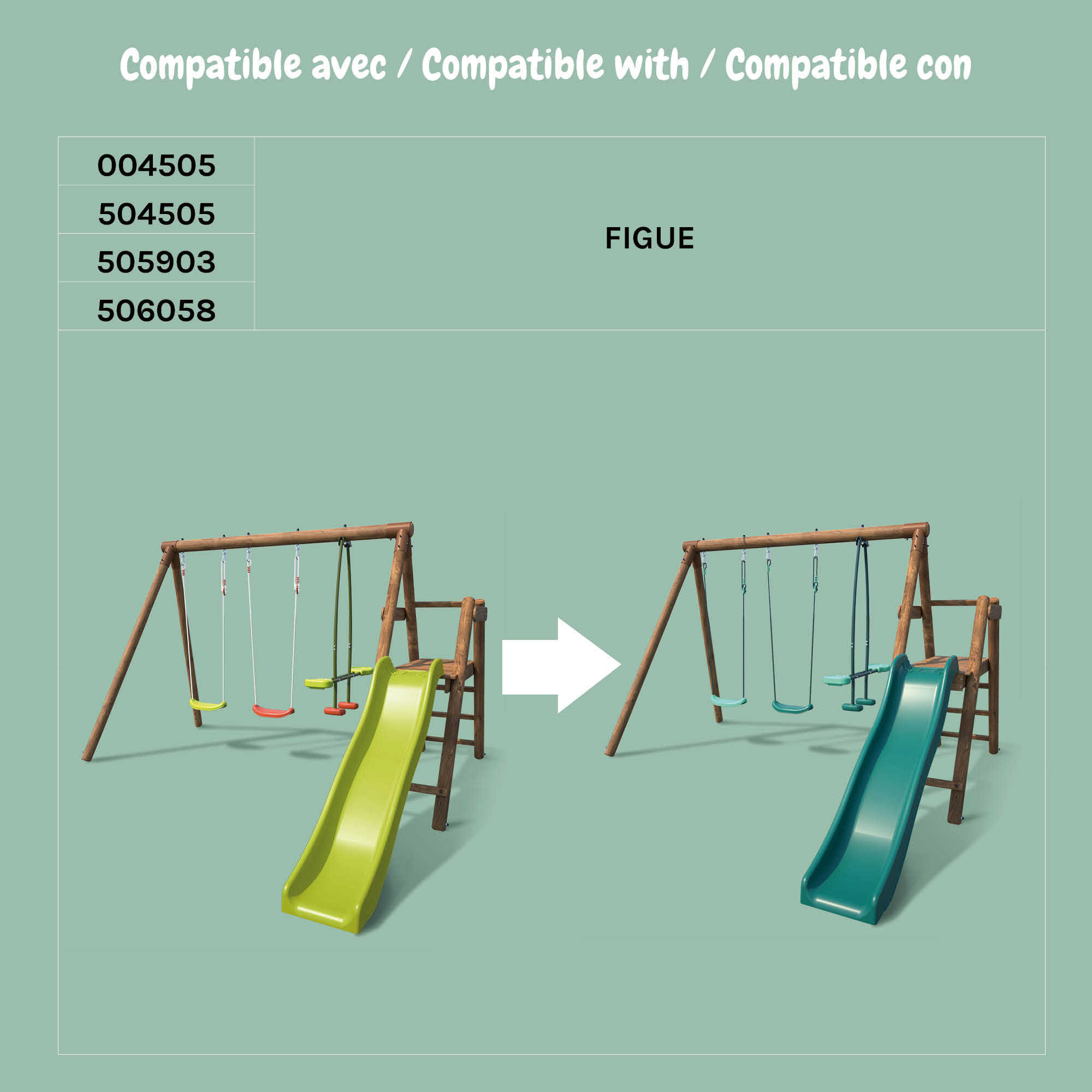 Le pack adopte des teintes vert menthe et vert foncé, apaisantes et naturelles, qui s’intègrent parfaitement dans un environnement extérieur. Ces couleurs sobres et harmonieuses permettent de créer un espace de jeu qui se fond dans votre jardin.