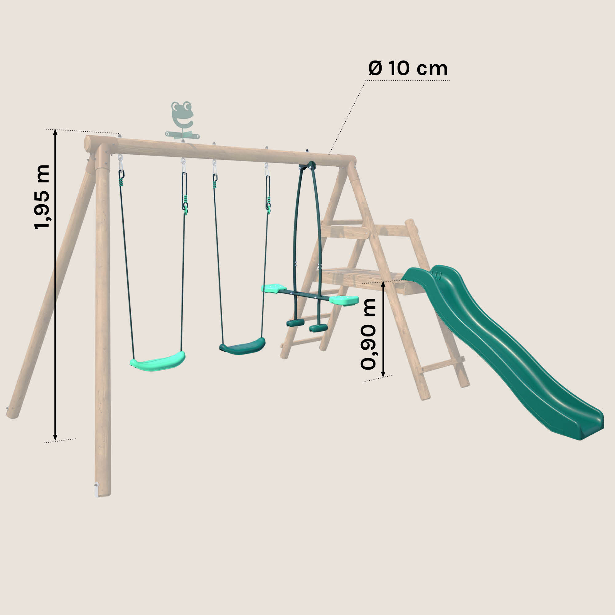 ⚠️ Attention : Les agrès ne sont pas compatibles avec les portiques en métal, et le siège face à face ne convient pas aux portiques à poutres carrées. Ce pack est spécialement conçu pour des portiques en bois avec poutre ronde de 10 cm de diamètre et de 1m95 de hauteur.