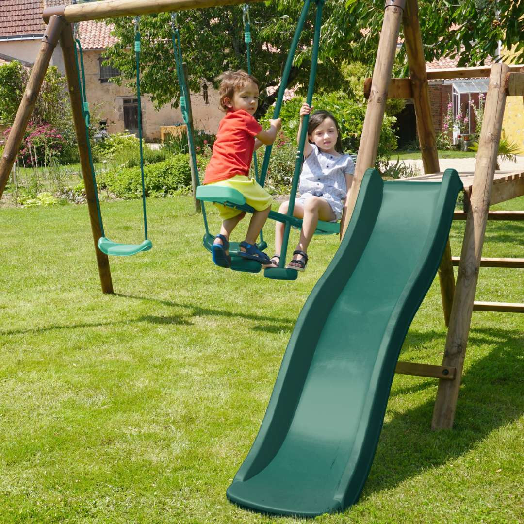 Vos enfants ont grandi ou vos agrès ont perdu de leur éclat ? Ce pack est idéal pour varier les plaisirs et prolonger les moments de jeu en extérieur. Grâce à cette combinaison d’agrès, chaque enfant y trouve son bonheur, du balancement doux au glissage rapide.