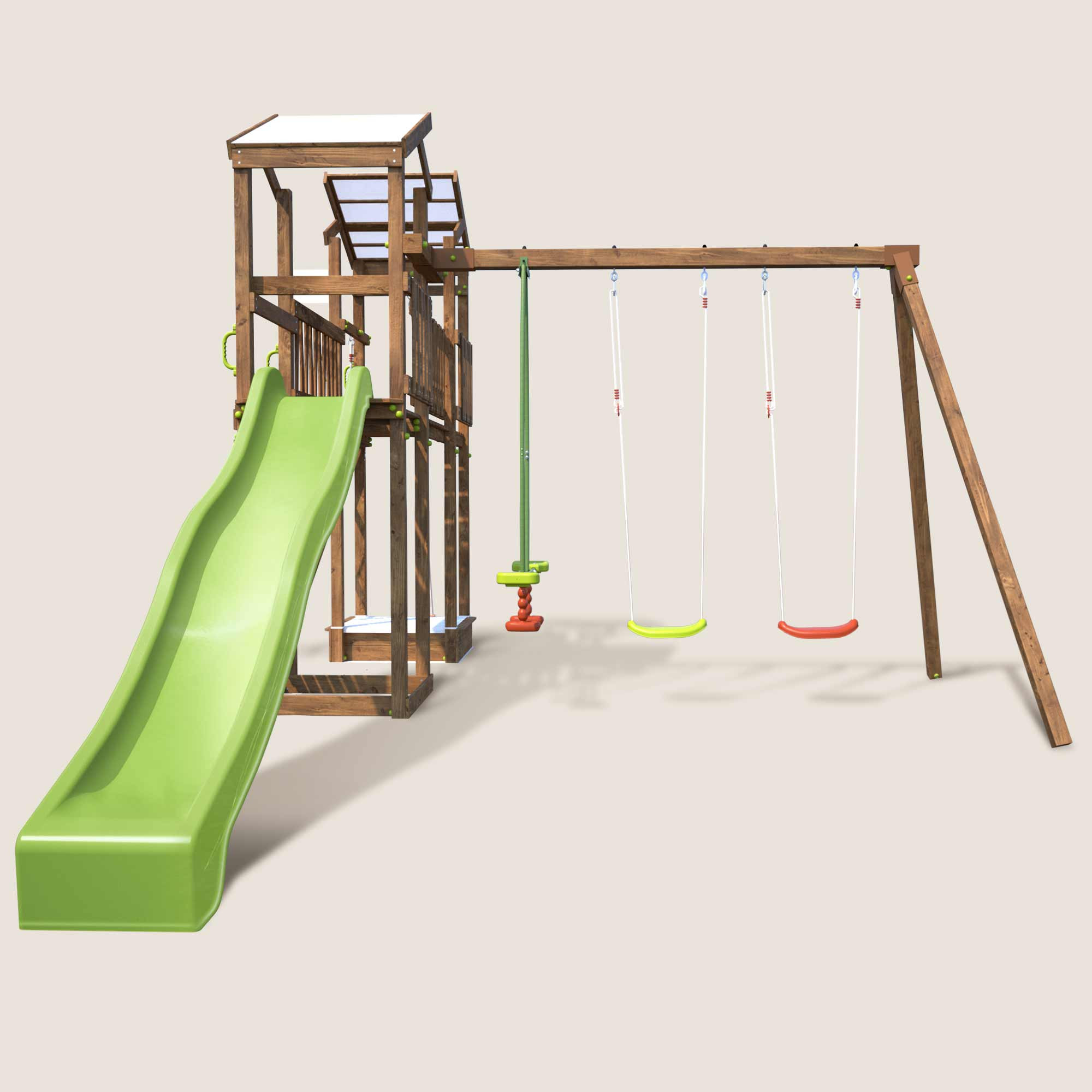 Aire de jeux 2 tours avec portique 3 agrès et toboggan FUNNY SWING & BRIDGE 150