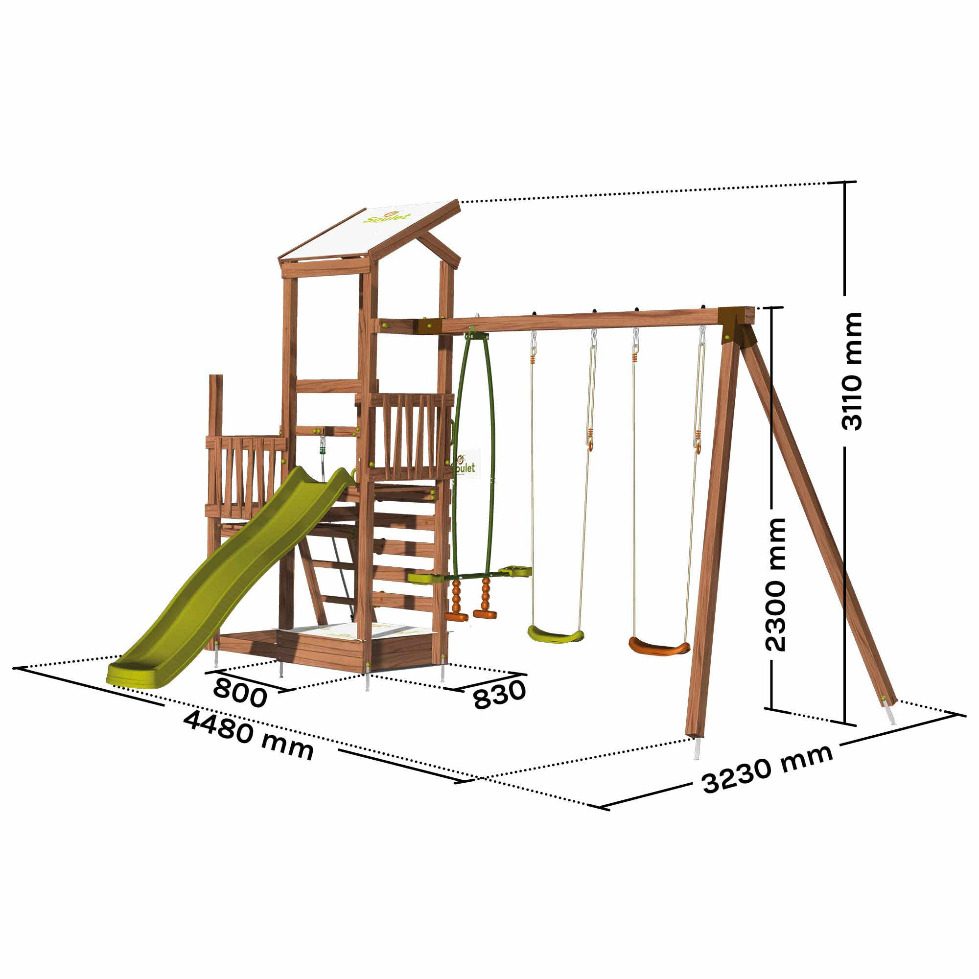C'est une structure en bois qui conviendra aux jardins un peu plus grand, et à toute la famille grâce à sa diversité d'agrès !