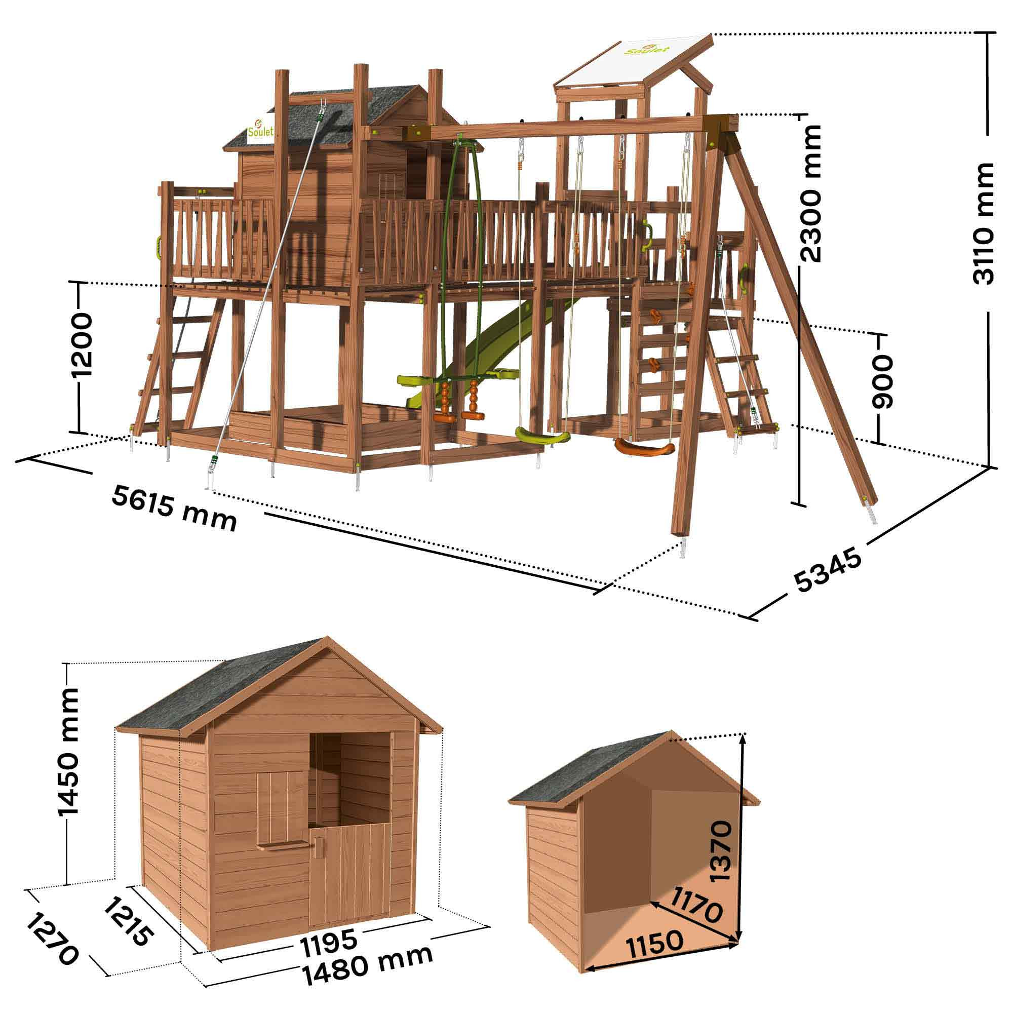 • Aire de jeux pour enfant maisonnette avec mur d'escalade et corde à  grimper - COTTAGE CRAZY - Dimensions du produit