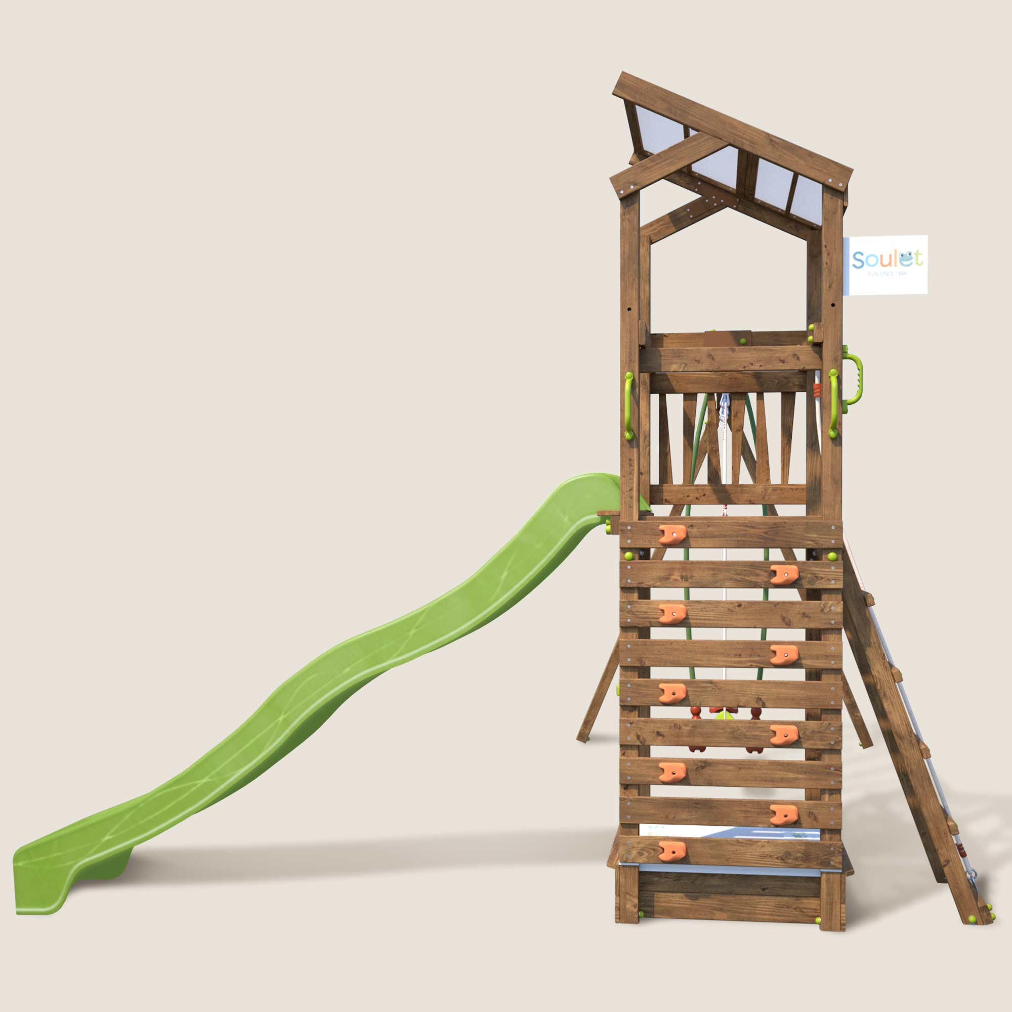 En point central de cette aire de jeux extérieurs Soulet, se trouve la tour en bois traité autoclave classe 4, couverte de jeux et propice au développement de l’imagination. Proposez aux enfants de voguer, de partir en exploration, de gravir des montagnes, ou de se créer un univers caché sous la tour… La tour extérieure dispose d’une plateforme à 1,50 m du sol, permettant de parfaitement s’installer pour ensuite redescendre en toboggan, après avoir grimpé à la corde ou avec le mur d’escalade.