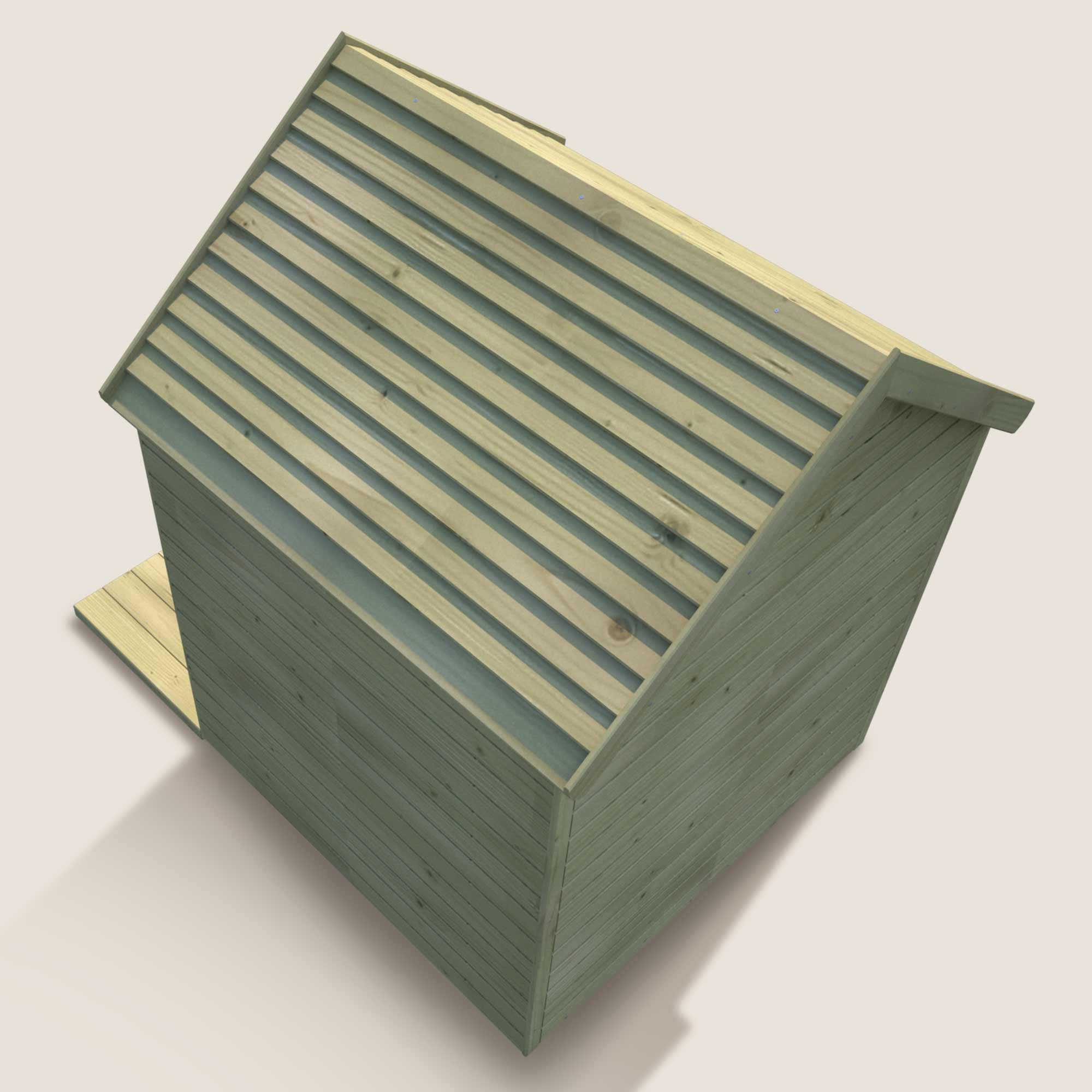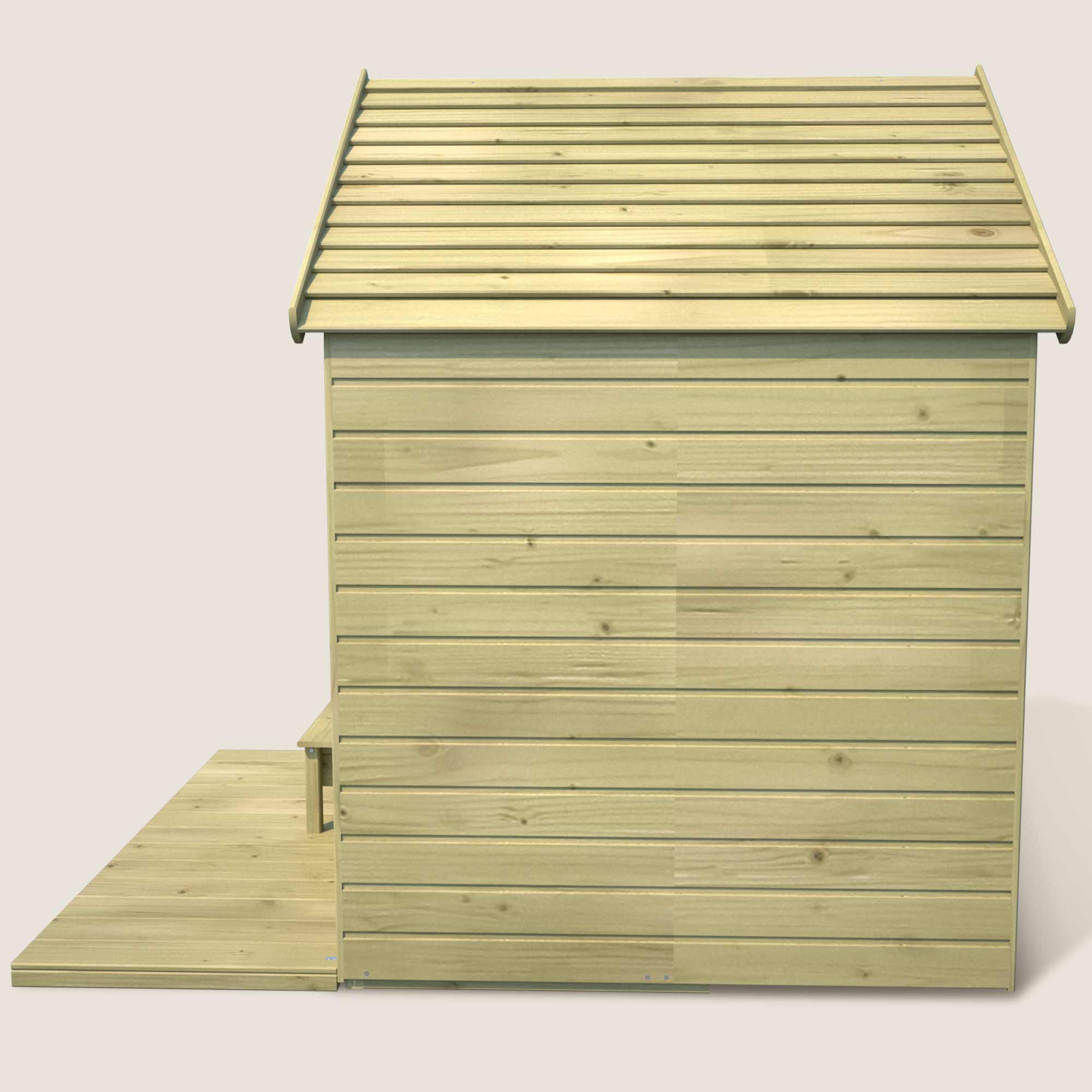 Cette cabane est équipée d’une demi-porte de 53 x 52 cm, idéale pour que les enfants puissent entrer et sortir facilement tout en étant protégés. La fenêtre permet une belle vue sur l'extérieur tout en offrant une certaine sécurité. La terrasse spacieuse (58 x 123 cm) permet aux enfants de jouer au grand air tout en restant à l’abri sous le toit de la cabane. Un banc en bois intégré ajoute un coin détente pour les petits aventuriers, où ils pourront faire une pause entre leurs aventures imaginaires.