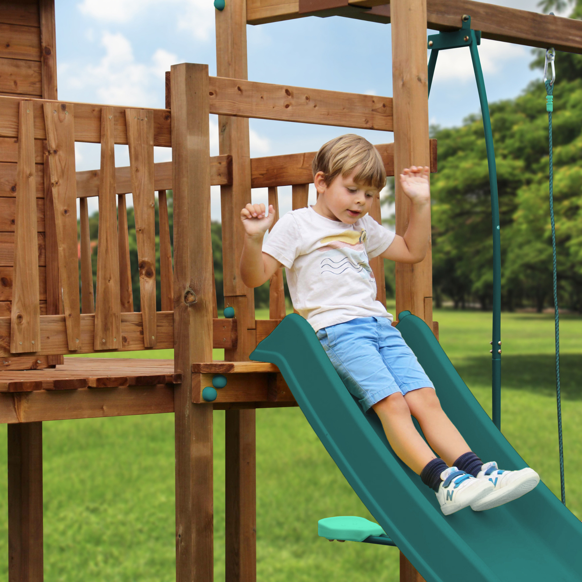 Desde la plataforma a 1,20 metros de altura, los niños pueden deslizarse con seguridad por el colorido tobogán. Un juego sencillo y efectivo para horas de risas y diversión al aire libre.