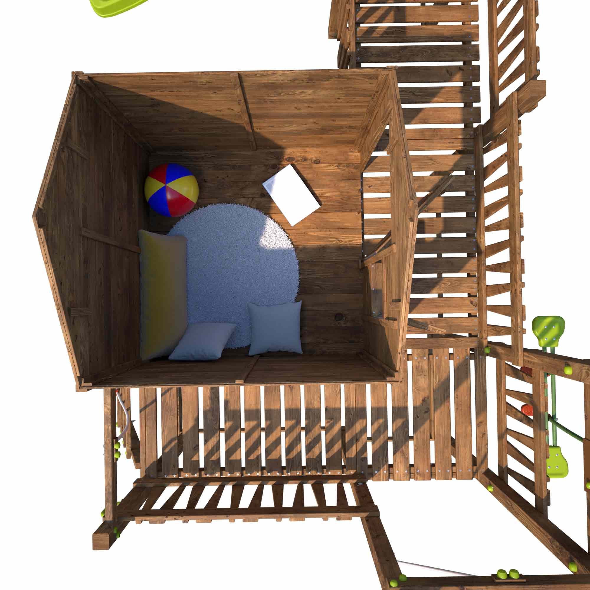 Situada a 1,20 m del suelo, la casa de juegos de madera permite a los niños crear su propio espacio especial en el jardín. Para jugar, relajarse o recibir a sus amigos, la cabaña de este parque infantil de madera se convertirá en el lugar ideal para todos sus momentos de diversión.