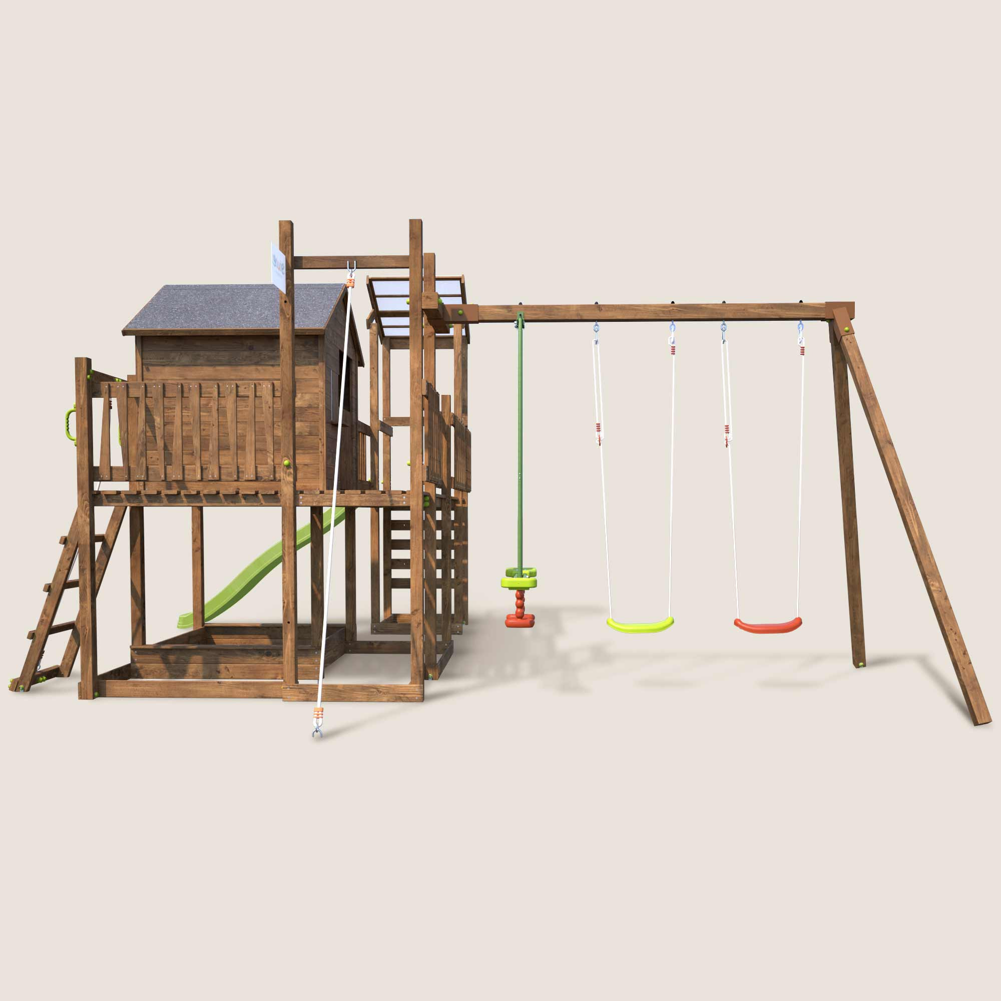 Un clásico de los juegos al aire libre, el columpio de nuestro parque infantil Cottage Funny viene equipado con dos columpios individuales y un columpio de cara a cara. Su estructura cuadrada de madera con esquinas de acero demostrará su resistencia y estabilidad durante muchos años.