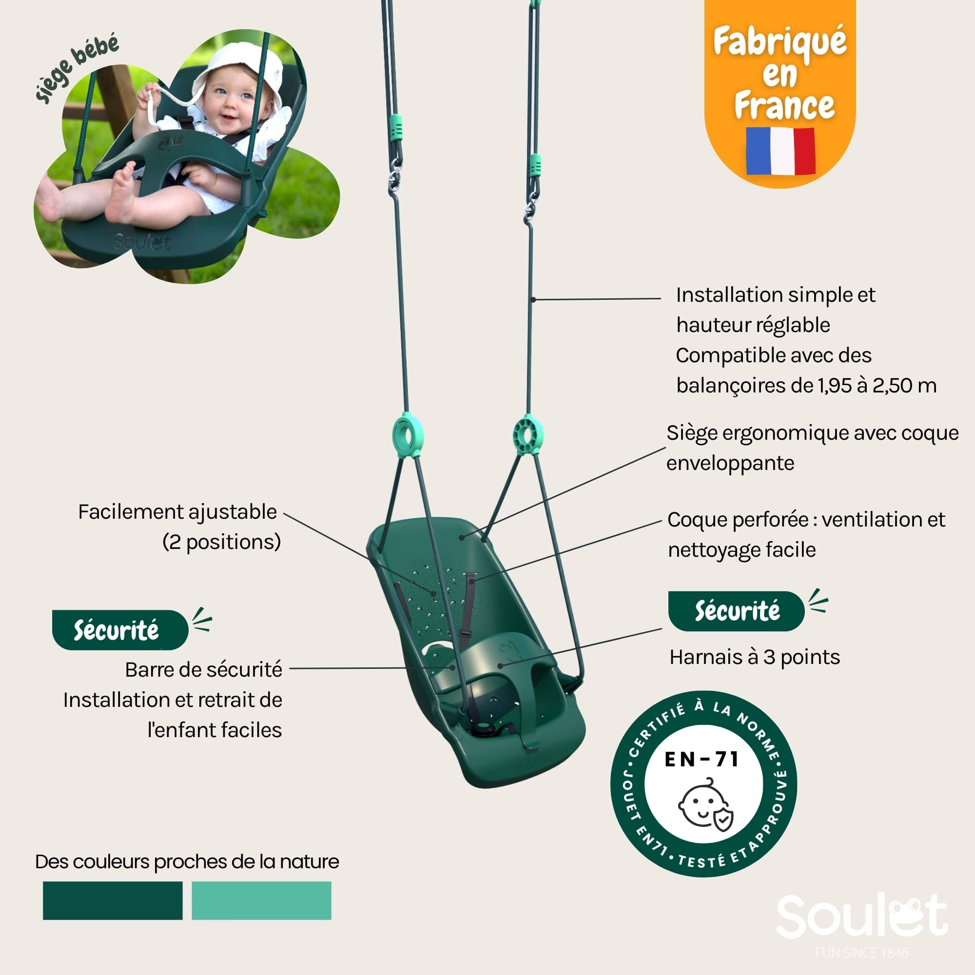 La silla de bebé Soulet Lilly está diseñada y fabricada en Francia para ofrecer un confort óptimo a los niños a partir de 6 meses. Puede instalarse en su estructura en 1 minuto, por 1 adulto. Este asiento universal se adapta a pórticos de 1,95 m a 2,35 m.
