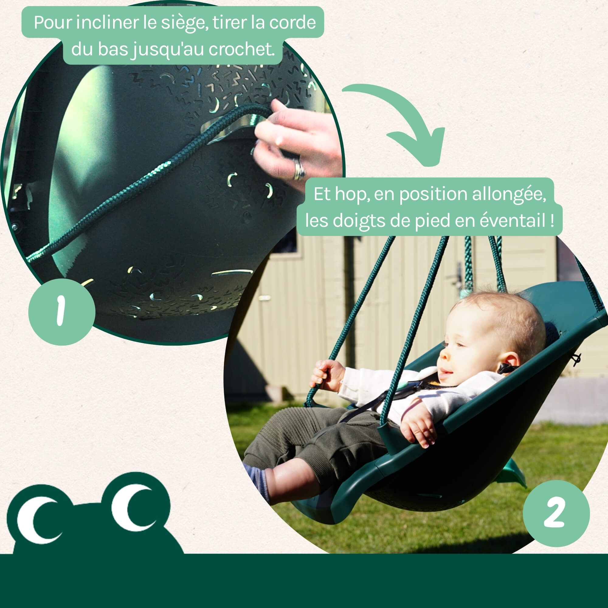 El columpio para bebé LILLY, de color verde oscuro, tiene un diseño relajante inspirado en la naturaleza. Estos colores combinan armoniosamente con su entorno y su jardín.