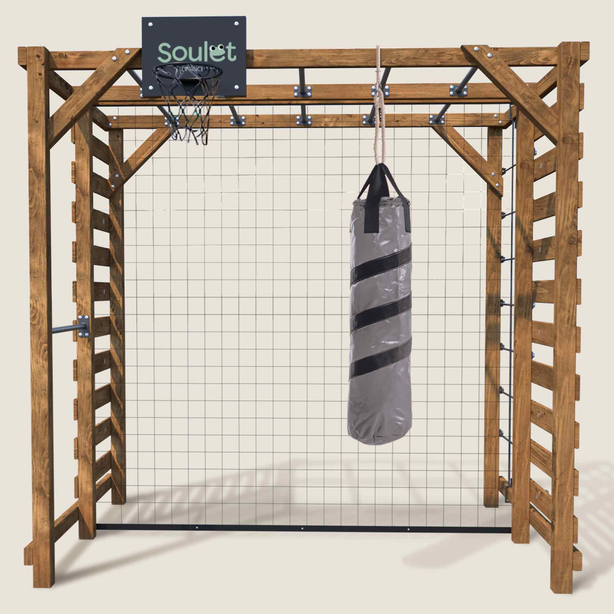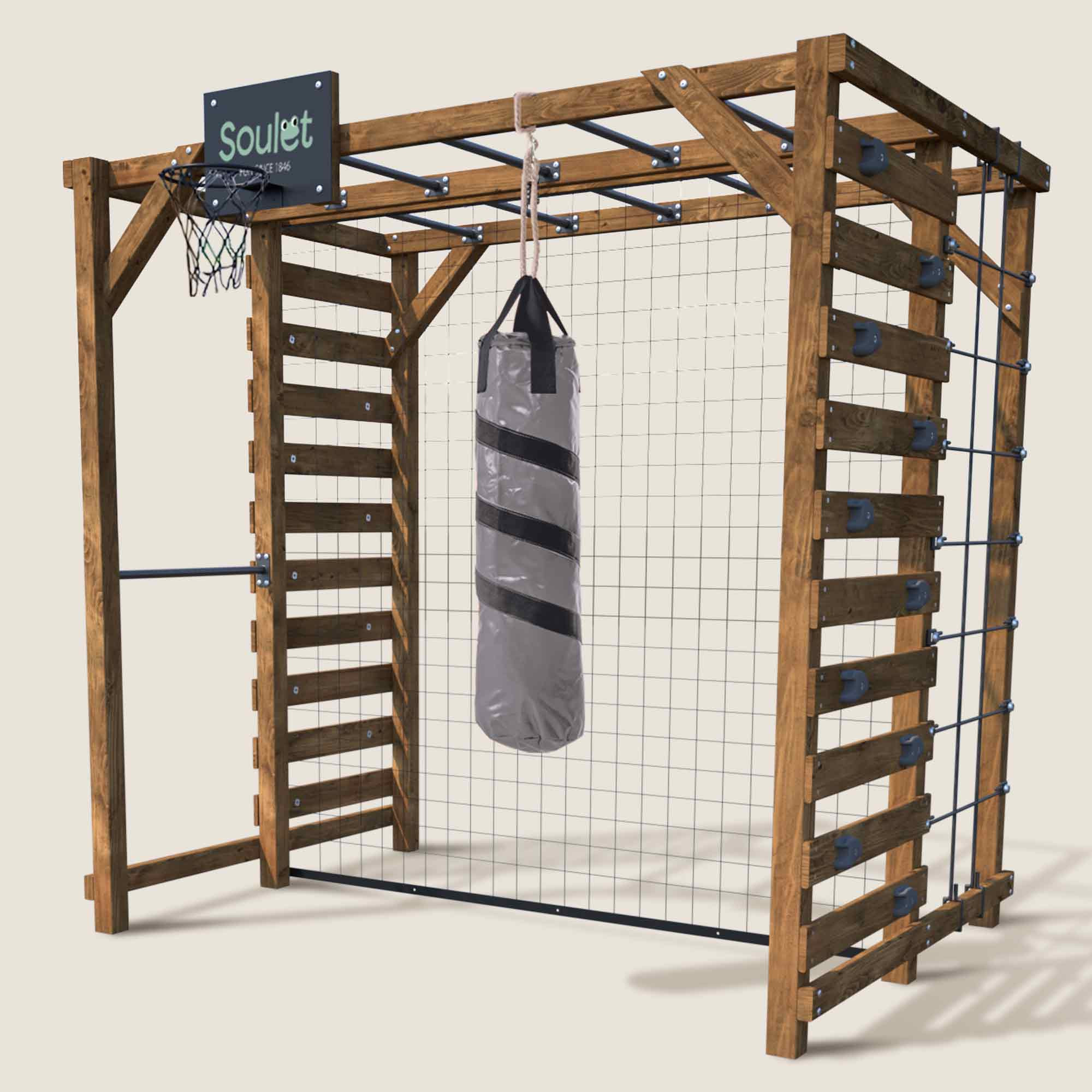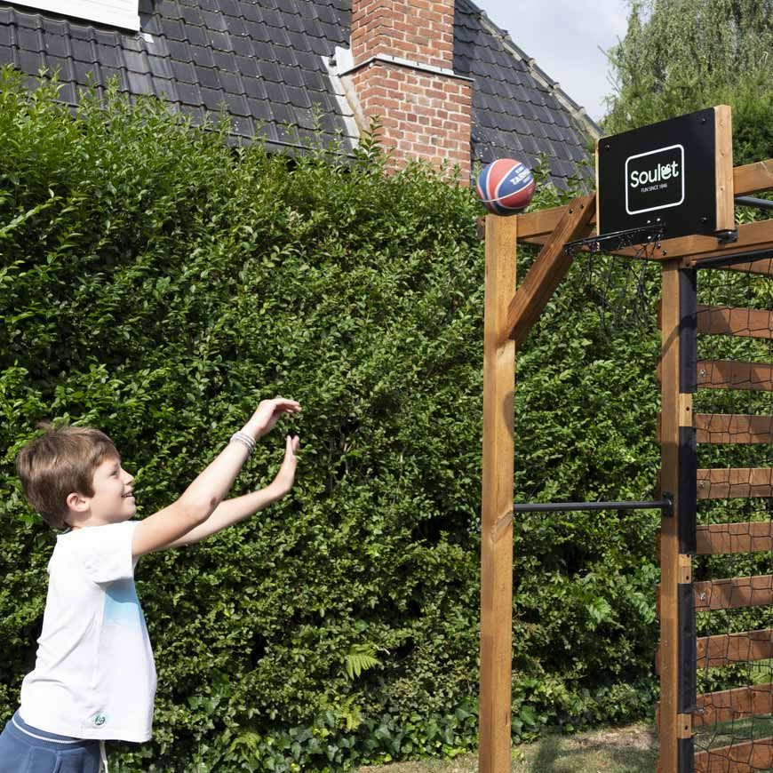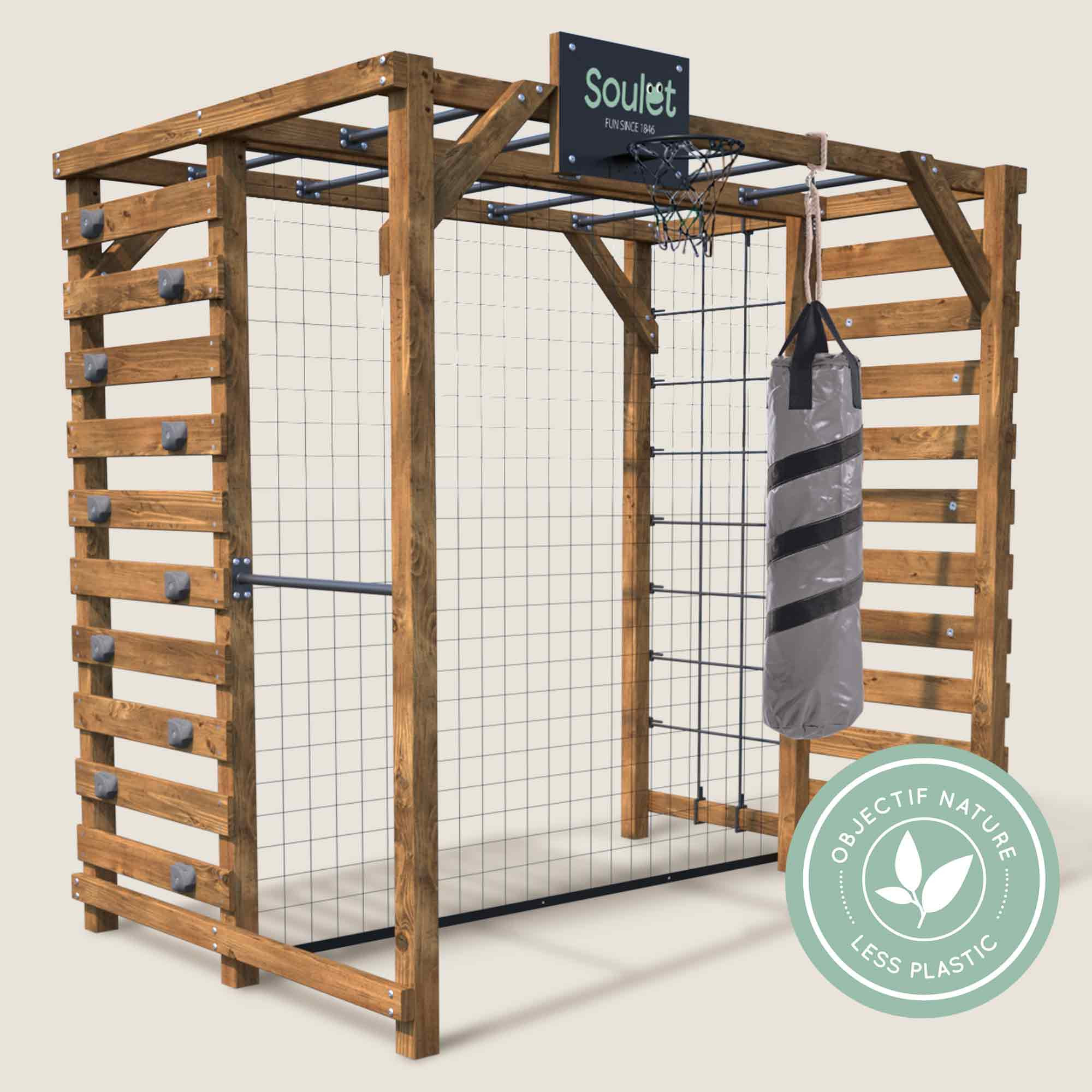 Este parque infantil está inspirado en la naturaleza y encarna la esencia misma del juego al aire libre, ofreciendo un espacio seguro y estimulante para la imaginación de los pequeños exploradores. Dispone de dos columpios de madera regulables para adaptarse a cada niño, acentuados por el suave balanceo de las cuerdas negras. A través de una combinación de desafíos lúdicos, los niños pueden alcanzar nuevas alturas trepando por la red de escalada o desafiando el muro de agarre.