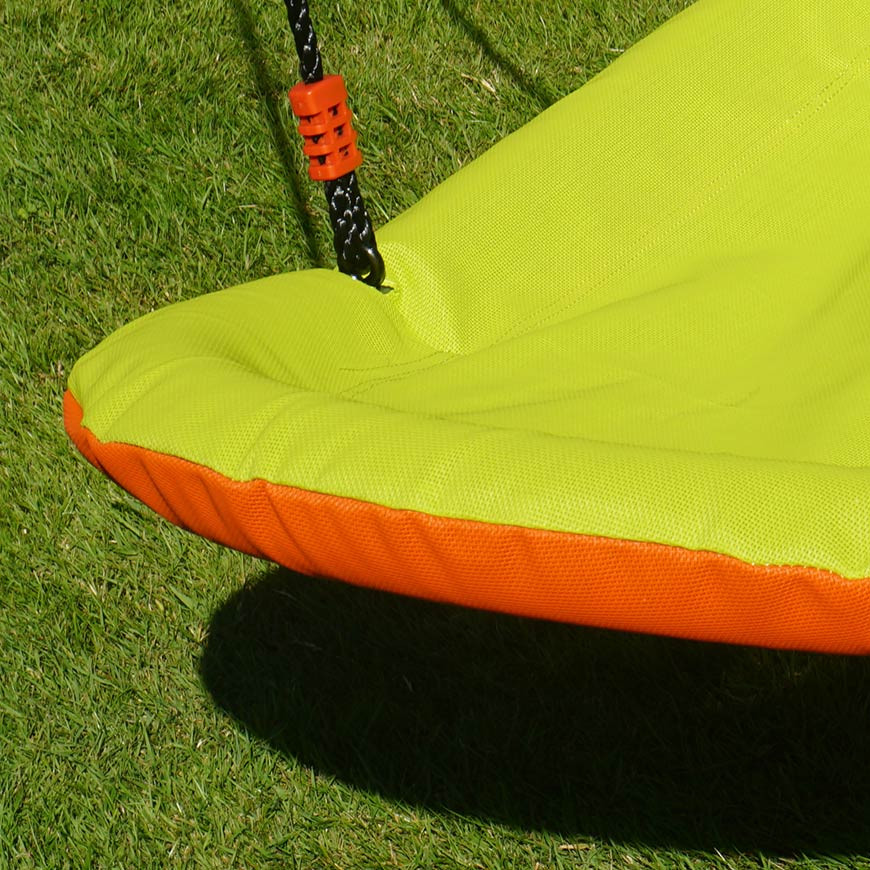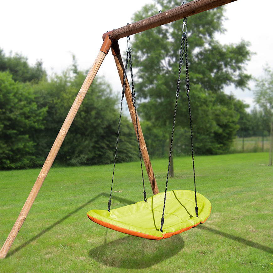 Este columpio cuenta con una robusta estructura metálica protegida por espuma amortiguadora y recubierta de textilene. Se fija al columpio mediante resistentes anillas metálicas y mosquetones (no incluidos), disponibles para su compra en nuestra página web.