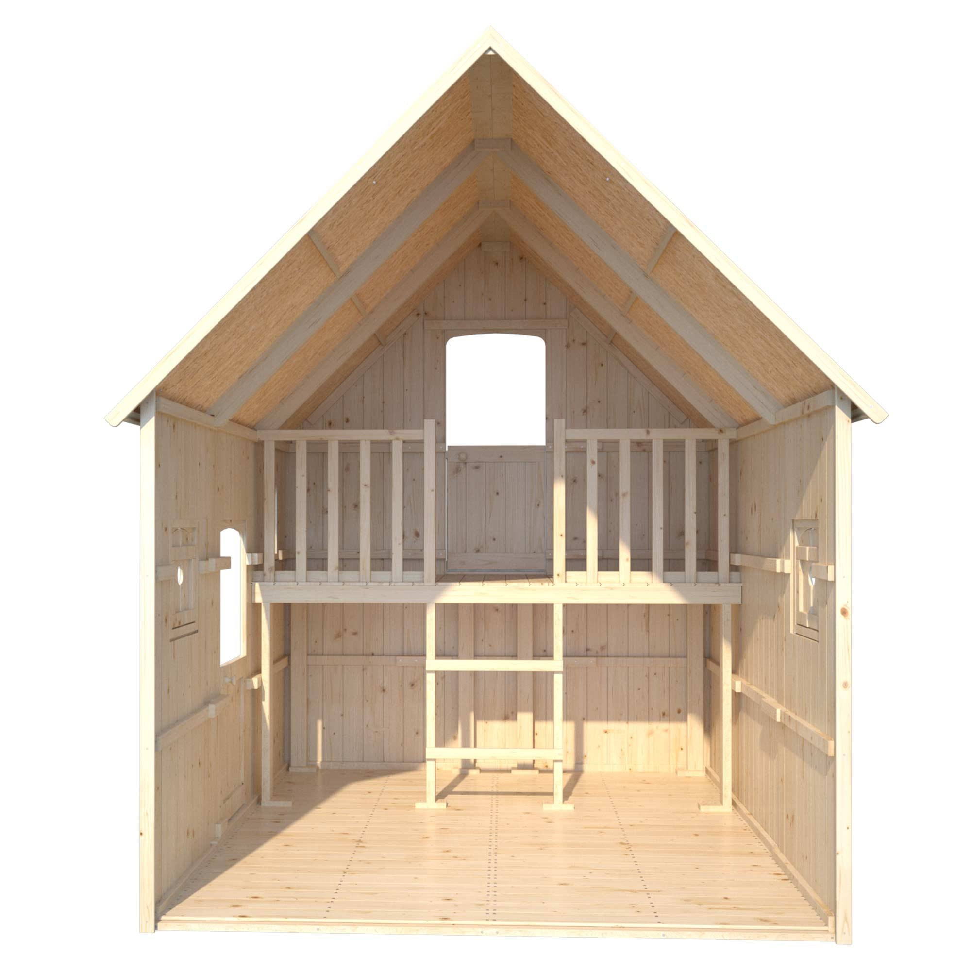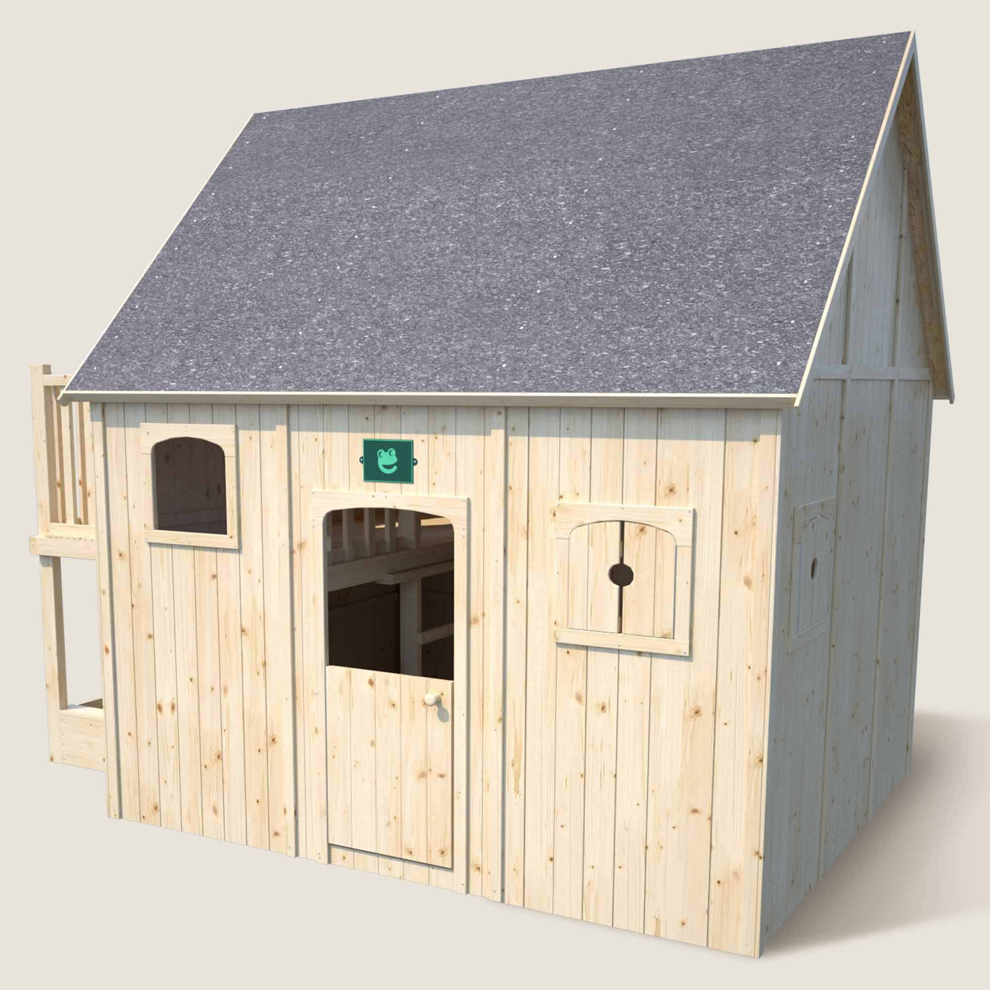 Los niños también pueden divertirse en el arenero integrado (arena no incluida), ideal para actividades creativas al aire libre. Las ventanas de la cabina están equipadas con persianas, una de ellas con un panel de plexiglás para mayor comodidad y visibilidad. La cabaña Duplex está diseñada según las normas de seguridad para juguetes infantiles, lo que garantiza un entorno de juego seguro y confiable.