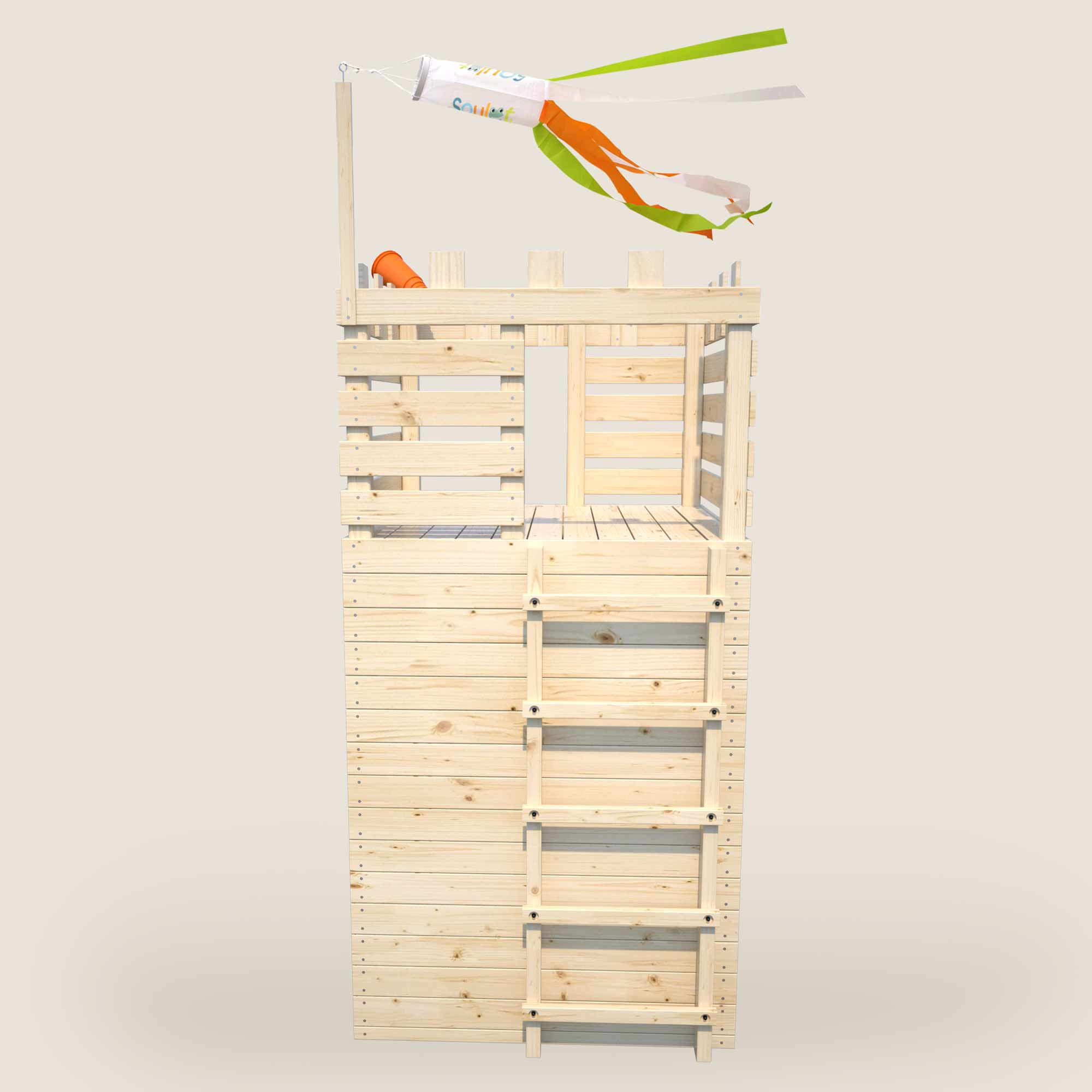 Gracias a su estructura en forma de torre, esta casita de juegos optimiza a la perfección el espacio de tu jardín. Los niños podrán disfrutar de su energía mientras juegan y conquistan nuevas aventuras. La plataforma elevada, asegurada por una barandilla de madera, permite que los niños jueguen con seguridad mientras disfrutan de una vista impresionante de su reino imaginario.