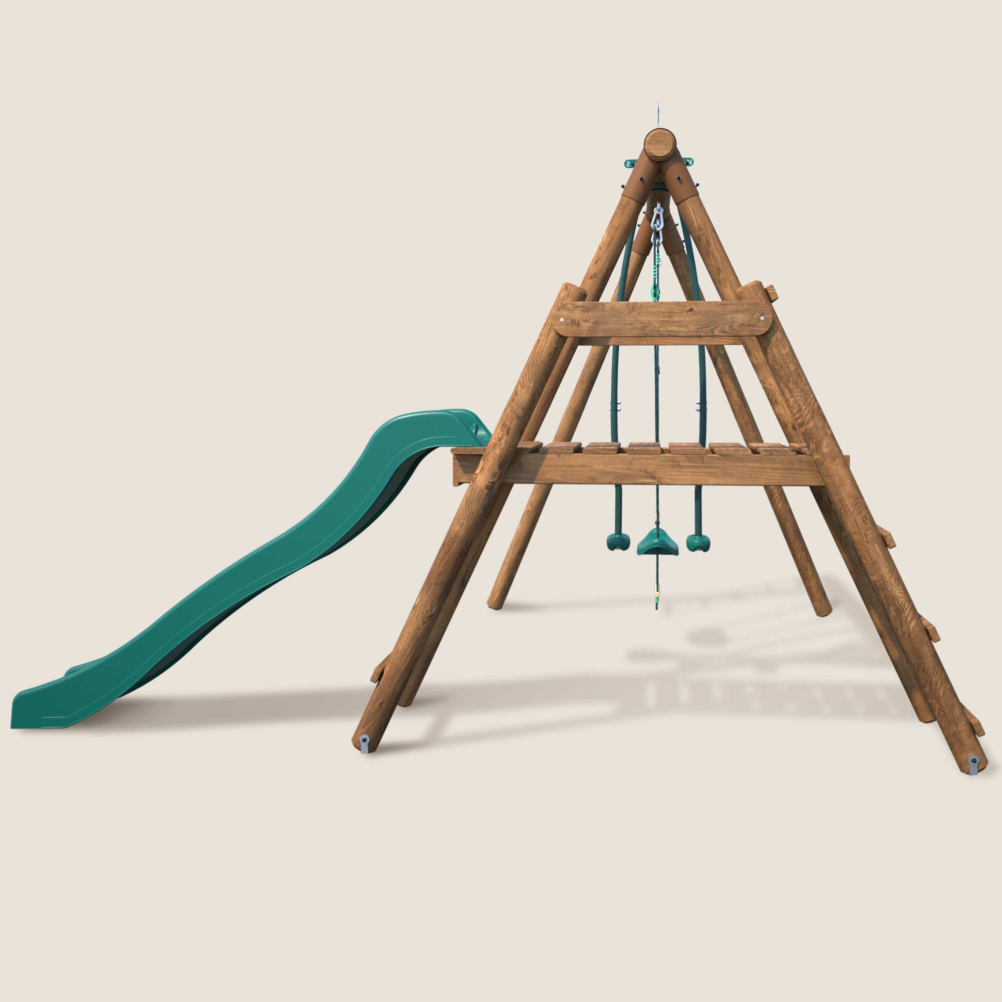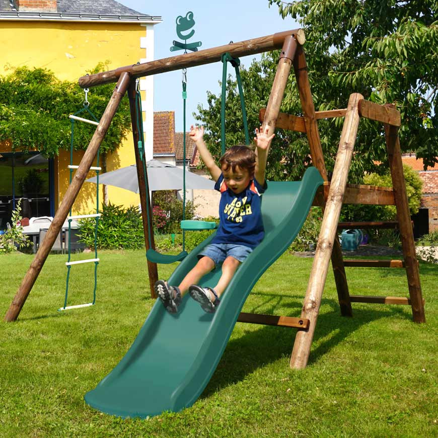 Pequeña estación de madera con 2 aparatos y tobogán de plástico - Menta