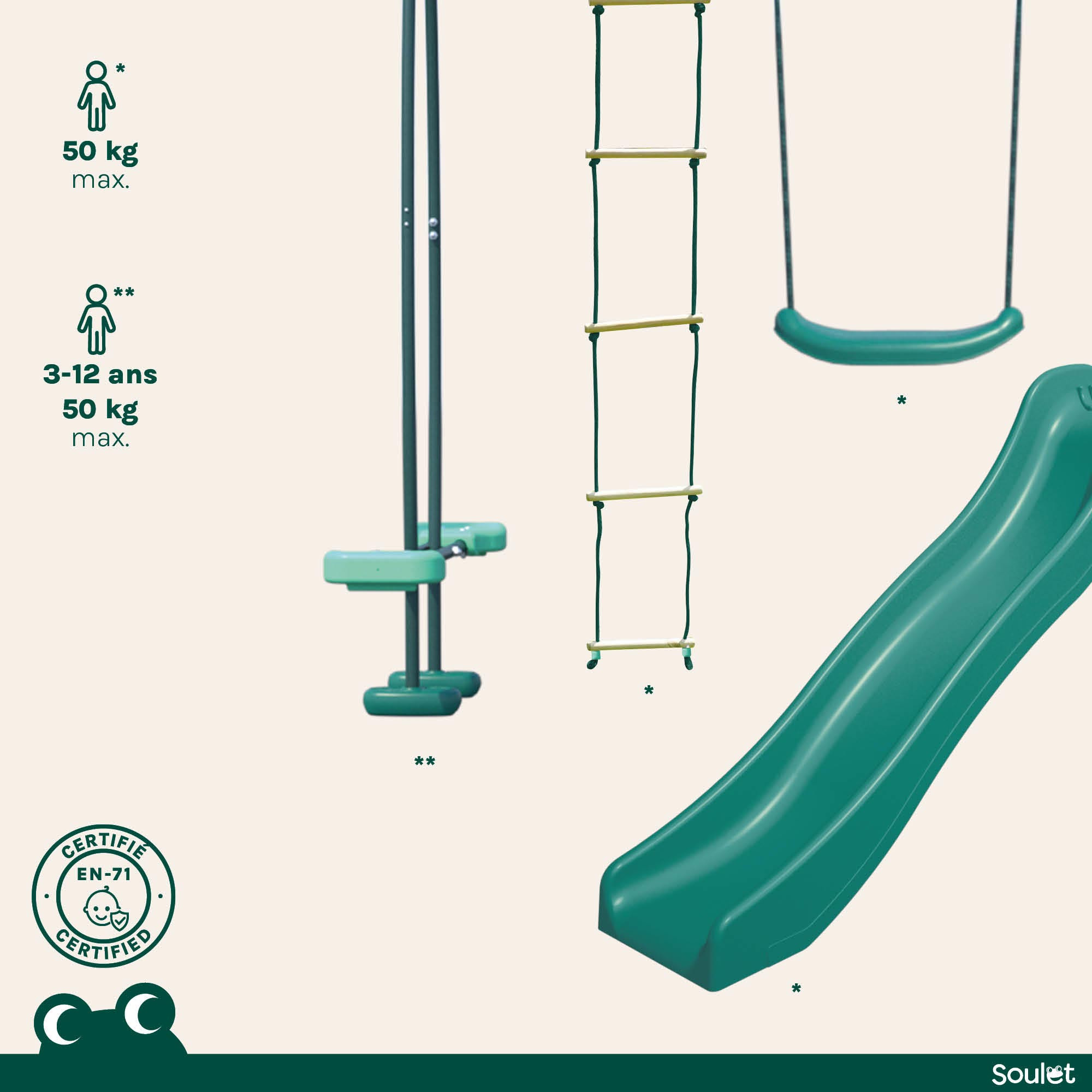 El columpio de madera Mûrier es perfecto para toda la familia, con cuatro juegos diseñados para todas las edades. La plataforma del tobogán, a solo 90 cm del suelo, es ideal para los más pequeños. Los niños pueden deslizarse con seguridad gracias a su diseño inteligente y a las barreras caladas, que permiten a los padres vigilarlos mientras juegan. El asiento individual ajustable permite adaptarse a las necesidades de cada niño.