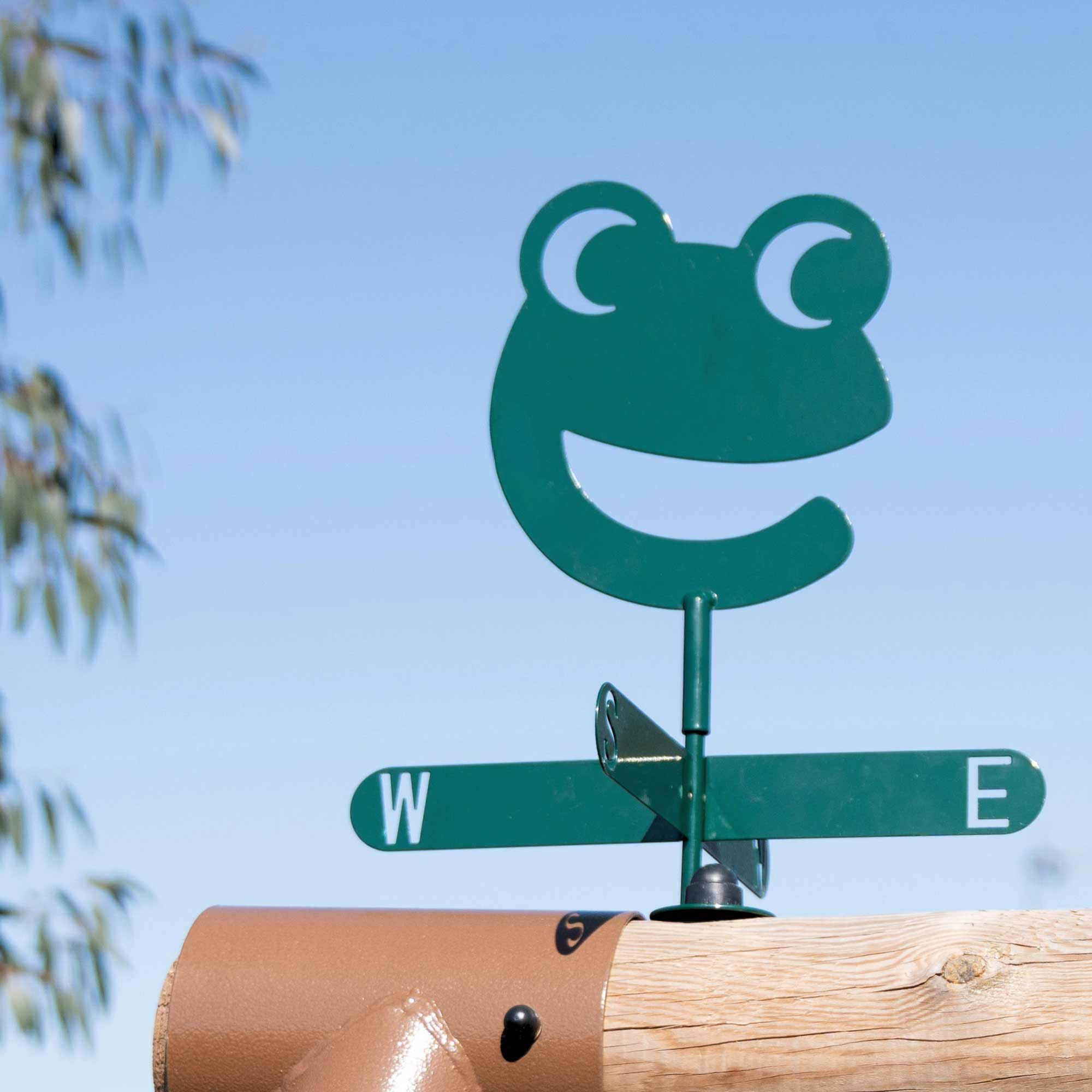 En la parte superior del columpio se encuentra una veleta de metal con la imagen de Suzy, la mascota de Soulet. Se orienta con el viento y permite a los niños aprender los puntos cardinales de forma lúdica mientras observan el tiempo.