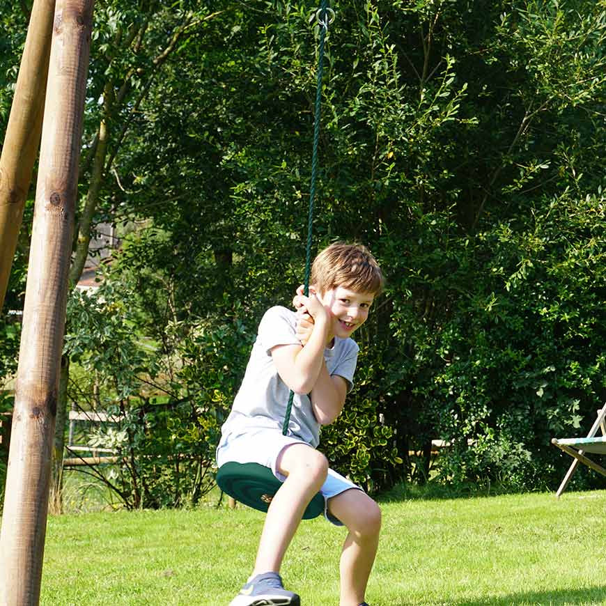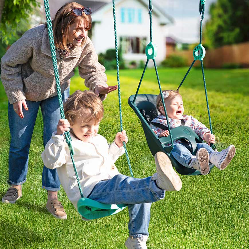A medida que tu hijo crece, puede seguir divirtiéndose con el equipamiento adecuado para su edad: un columpio clásico para niños mayores y una divertida y dinámica cuerda de disco. El conjunto se ajusta fácilmente gracias a un sistema de cuerdas ajustables con mosquetones resistentes, para adaptarse a la altura de cada niño.
