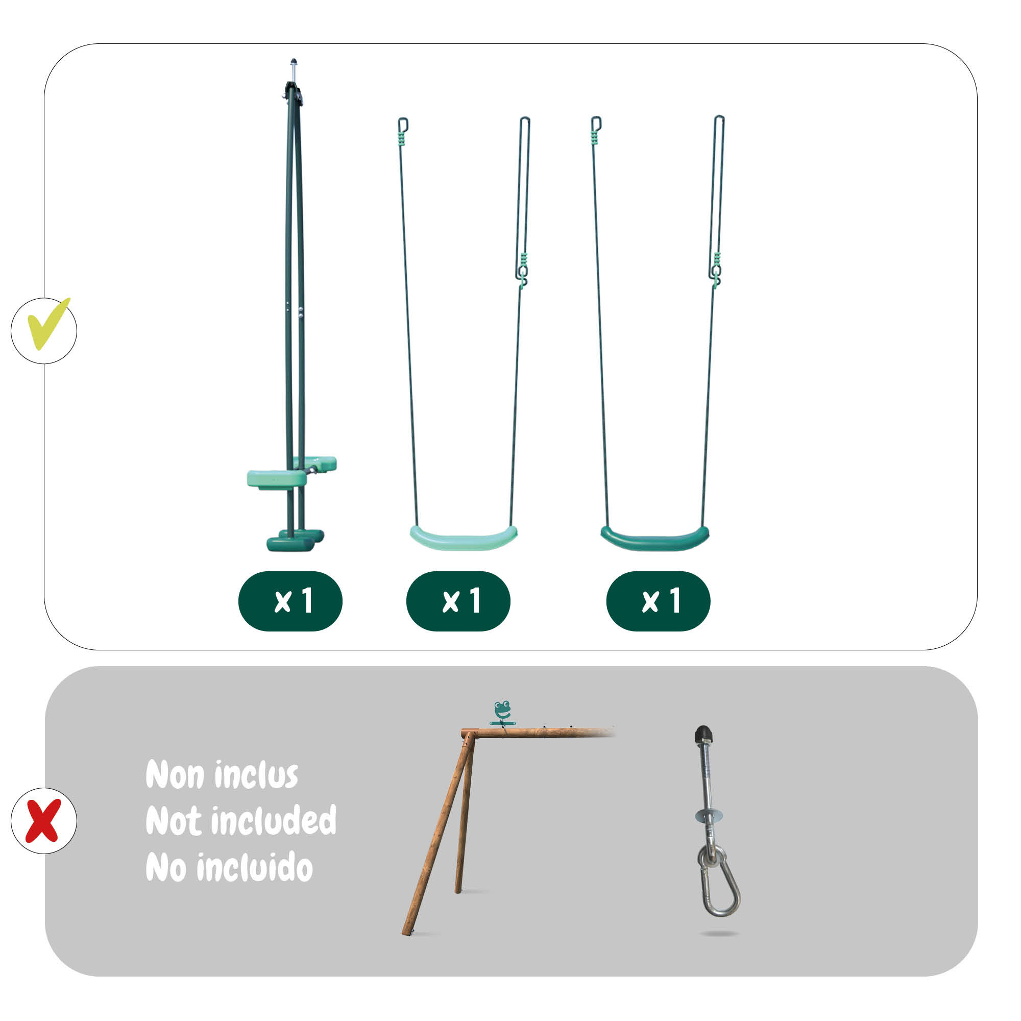 ⚠️ Precaución: Los columpios no son compatibles con columpios de metal, y el asiento de columpio de doble cara no es apto para columpios con vigas cuadradas. Este juego está diseñado específicamente para columpios de madera con una viga redonda de 10 cm de diámetro.