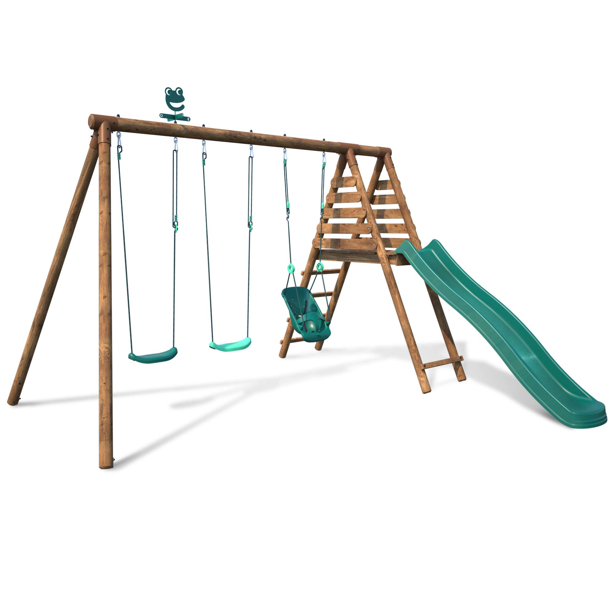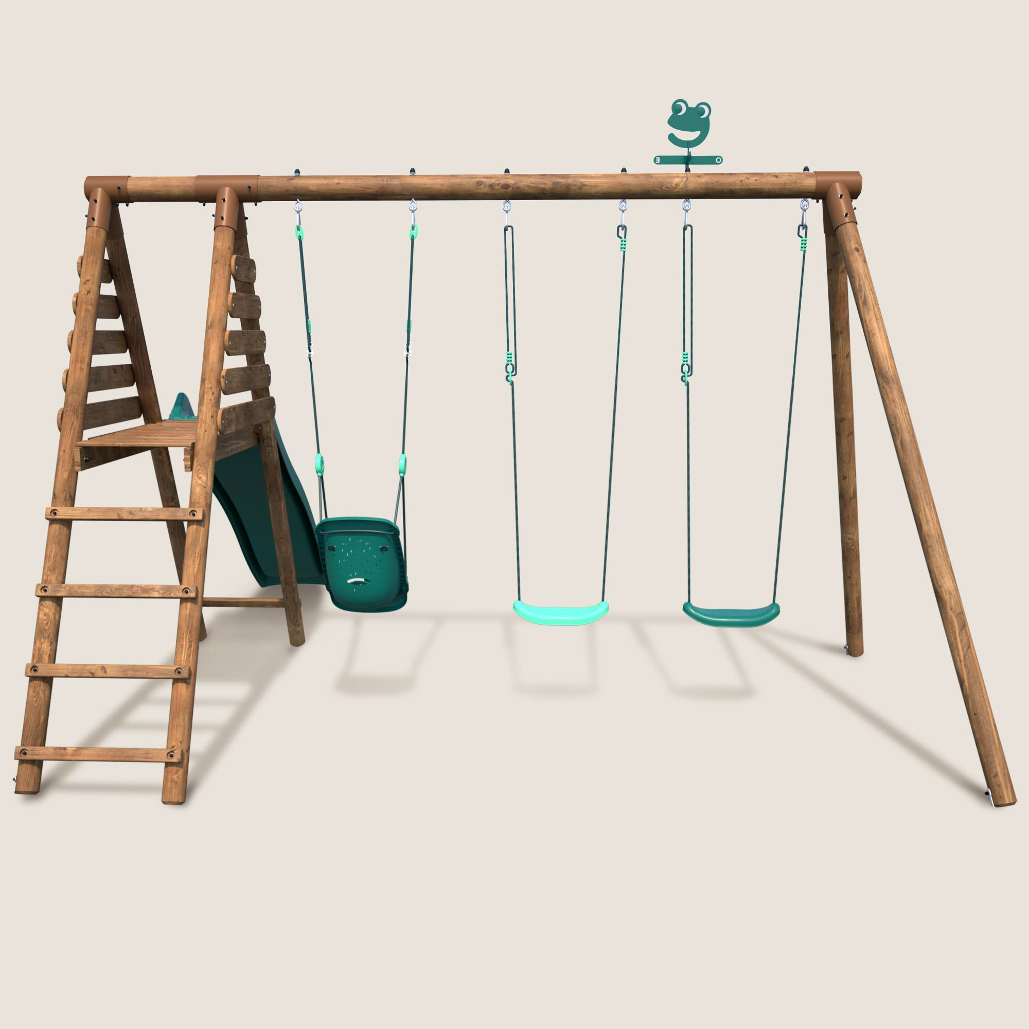 A medida que los niños crecen, pueden disfrutar de dos columpios de altura regulable, incluyendo un columpio cara a cara para momentos especiales juntos. Este icónico juguete les permite columpiarse solos o en pareja, estimulando la coordinación y la alegría de compartir. ¡Seguro que las risas resuenan en todo el jardín!