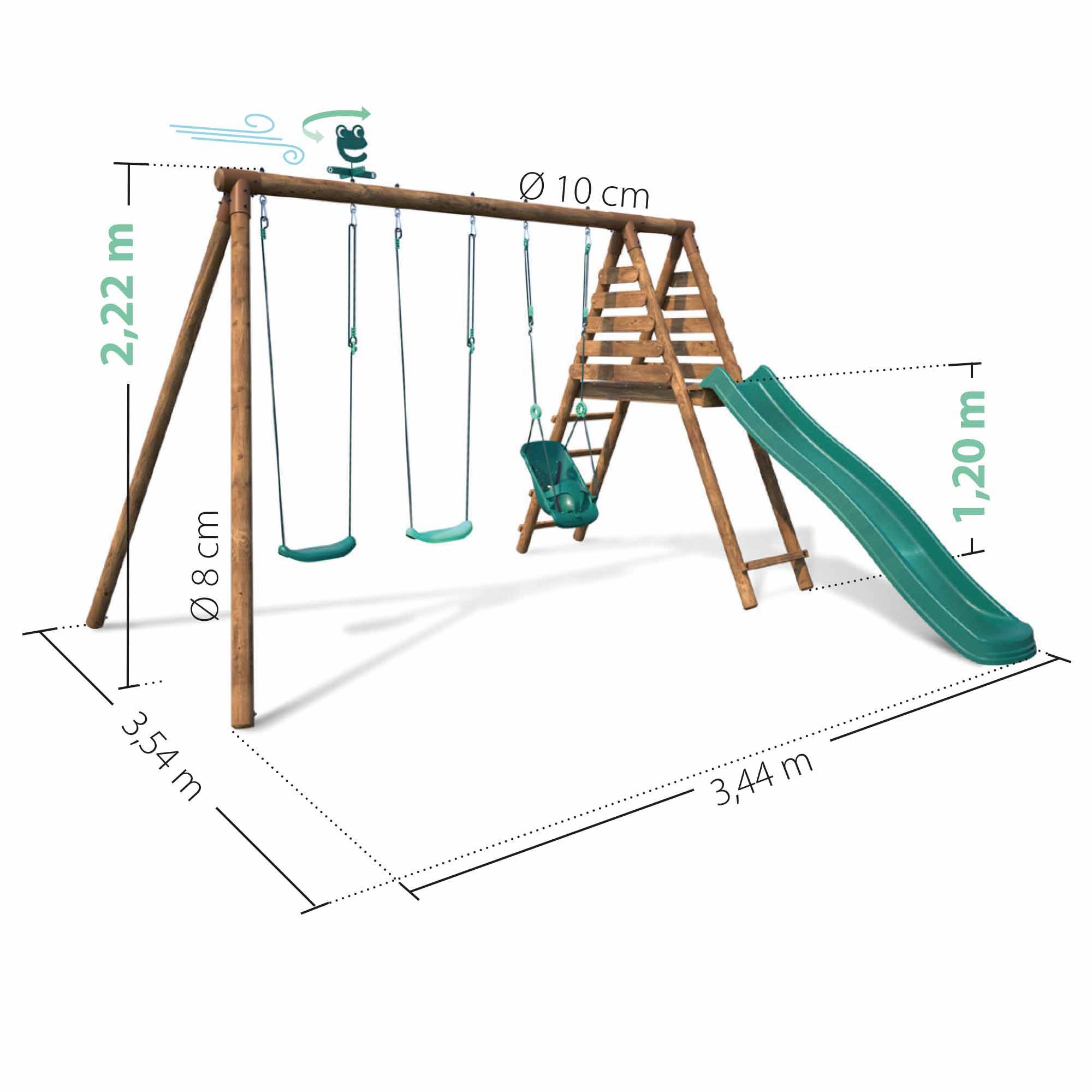 El columpio Ankara incluye un tobogán verde oscuro con forma de ola, montado sobre una plataforma de 120 cm de altura equipada con barandillas de seguridad. Los niños disfrutarán deslizándose una y otra vez, sin salir de la comodidad de su propio jardín. ¡Un accesorio imprescindible que sustituye a la perfección las salidas al parque!