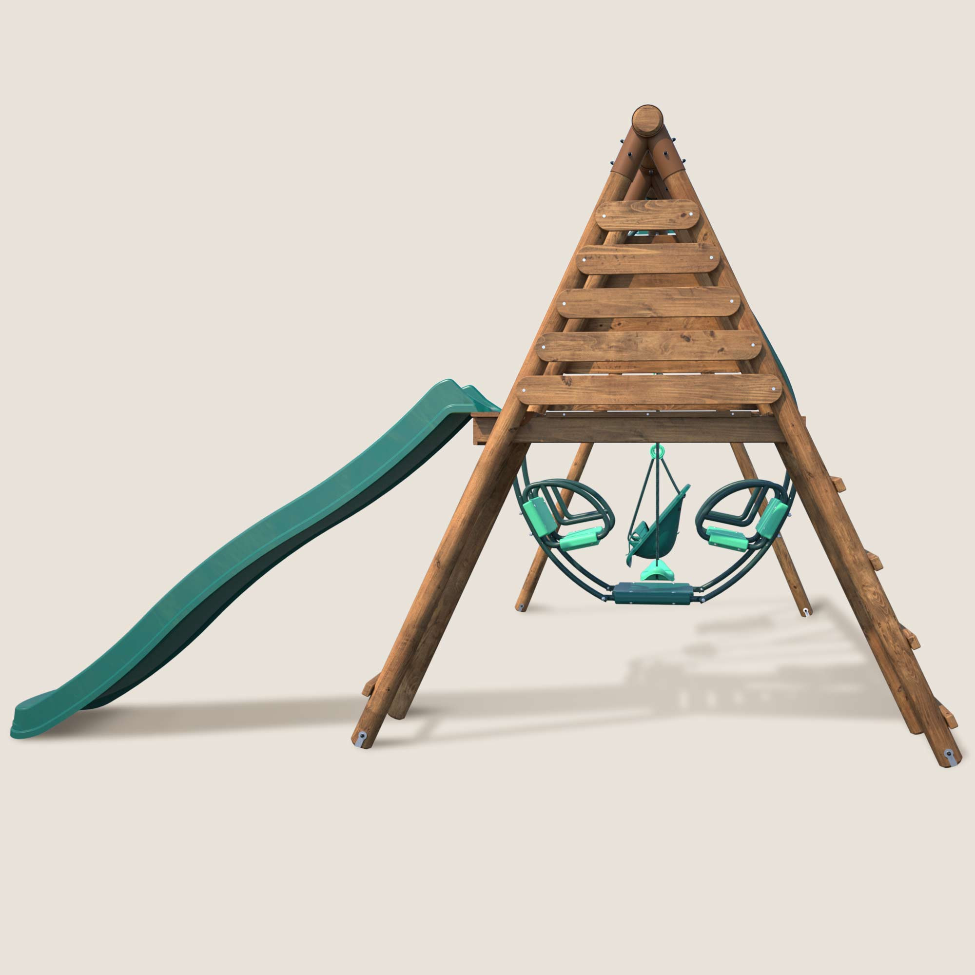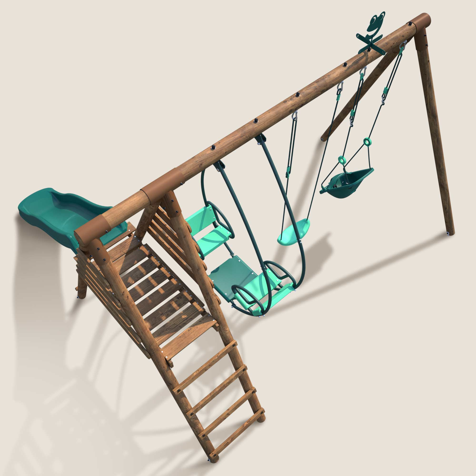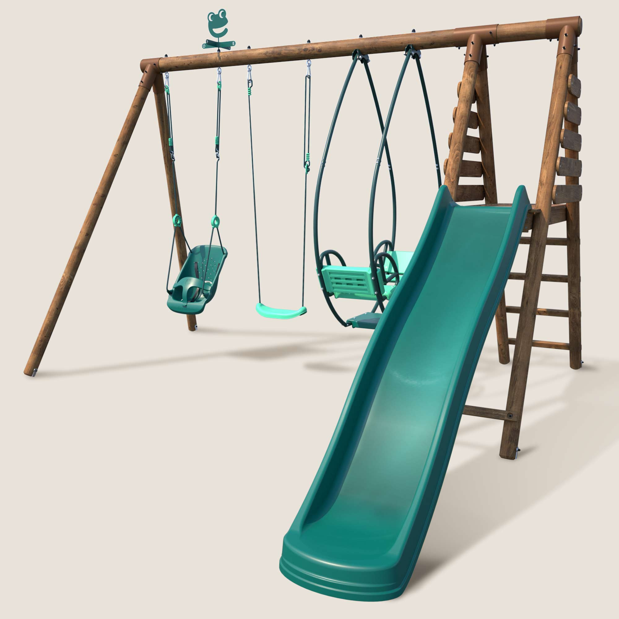 La zona de juegos Colza, con su estructura de madera y accesorios en delicados tonos verde agua y verde oscuro, crea una paleta elegante y sutil. Estos colores naturales se integran perfectamente en el entorno exterior de tu jardín.