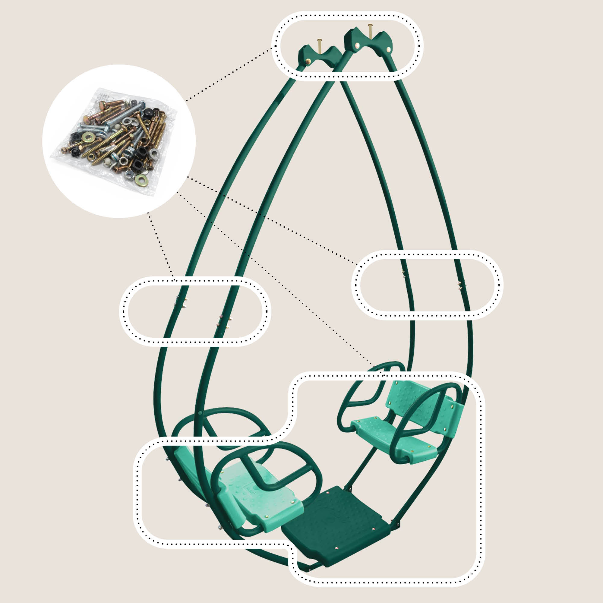 - Installation : L'installation de la visserie doit être effectuée selon les instructions figurant dans la notice d'origine de votre balancelle Soulet. Il est important de ne pas négliger cette étape afin de garantir la sécurité des enfants et la stabilité de la structure. Assurez-vous que chaque vis et écrou soit bien serré et que les cache-écrous soient correctement installés pour éviter tout risque de blessure.