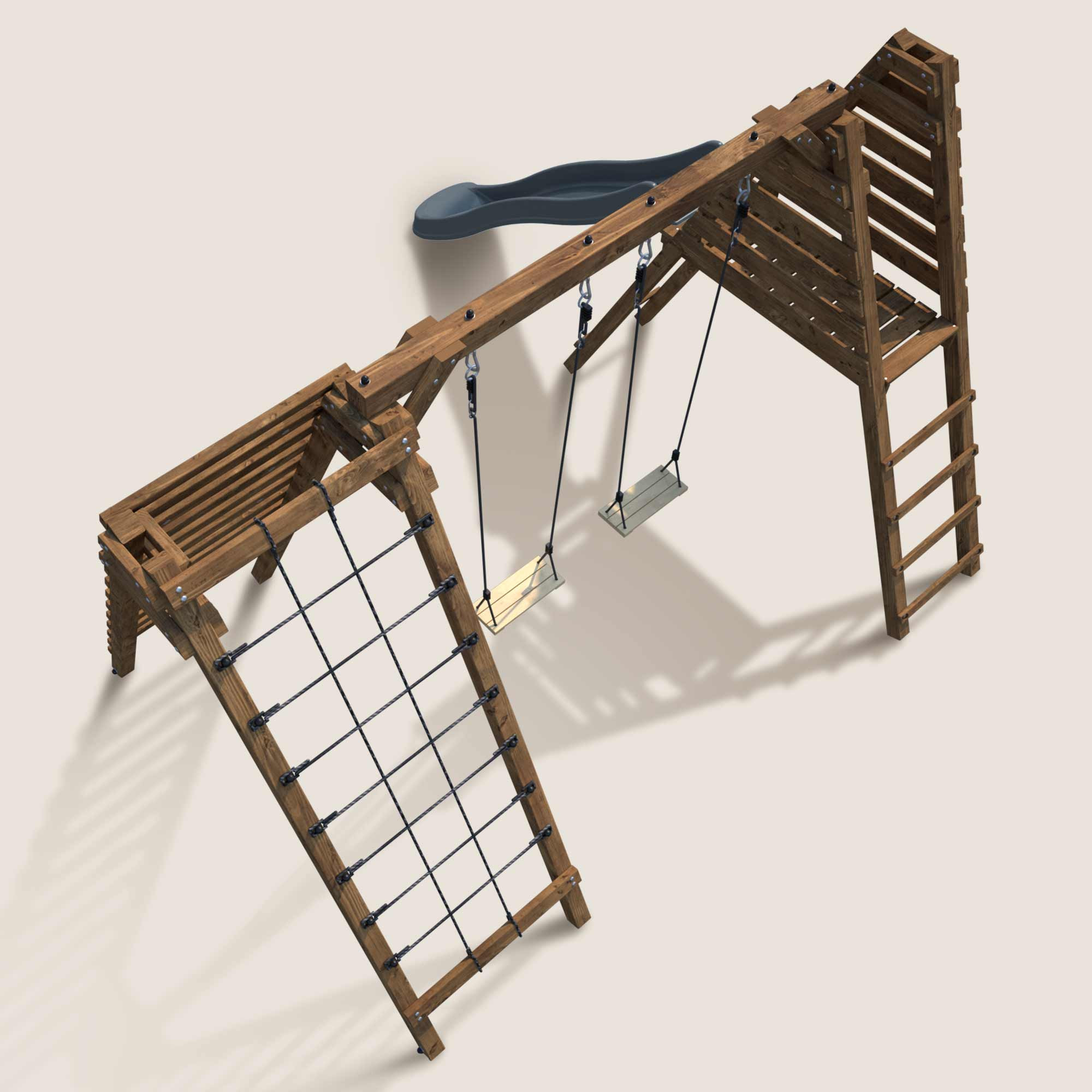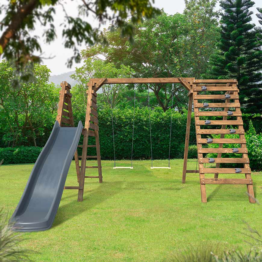 Aire de jeux en bois avec 2 balançoires, mur d'escalade et toboggan ISIS