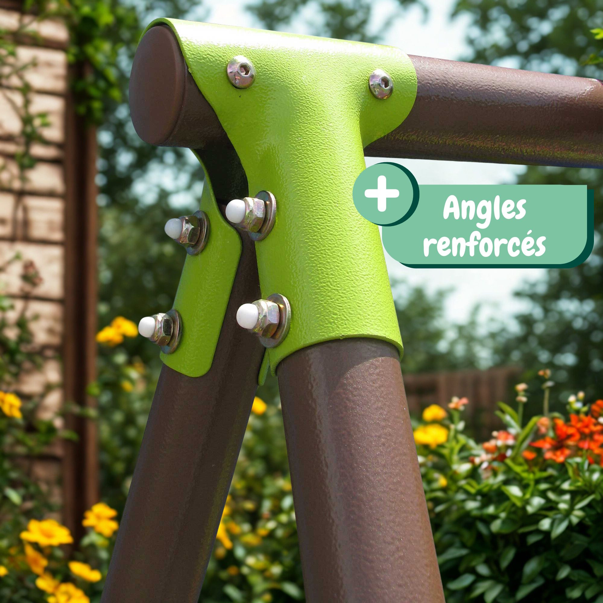 Grâce aux tubes pré-percés et aux mousquetons fournis, les balançoires se fixent très facilement. Les angles de la structure sont renforcés pour plus de stabilité, offrant une résistance optimale à l’usage quotidien. Le kit de scellement fourni (hors béton) permet d’ancrer solidement le portique dans le sol pour une installation durable et sans risque de basculement.