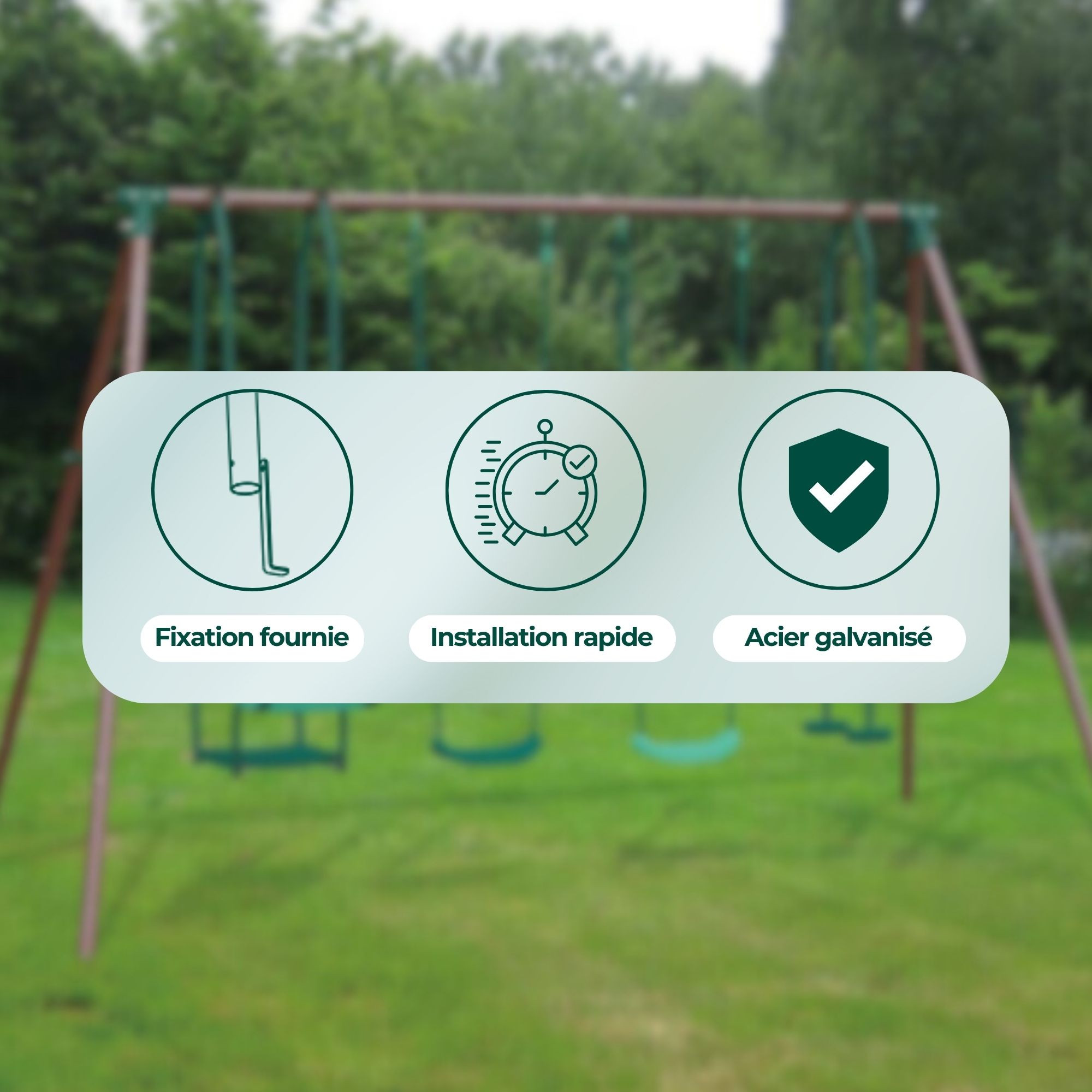 L'installation des balançoires est simple et rapide grâce aux mousquetons inclus. Les angles renforcés de la structure assurent une stabilité optimale, tandis que les tubes en acier galvanisé, robustes et pré-percés, facilitent un montage précis et durable.