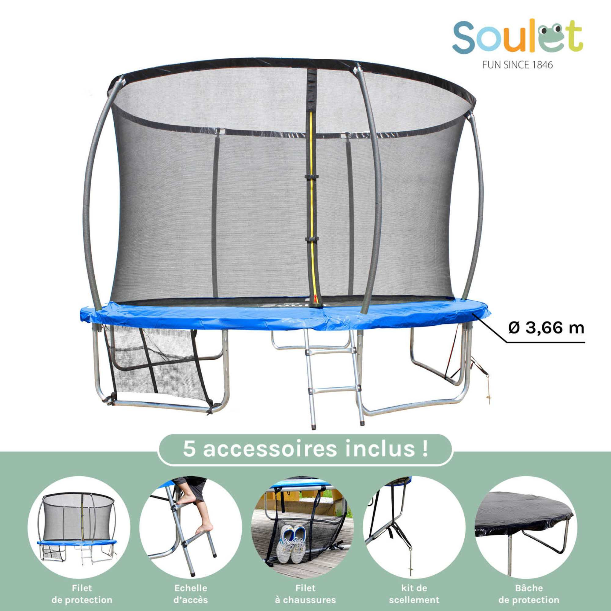 Le trampoline est bien plus qu’un simple jeu de plein air : c’est un véritable terrain d’aventure pour vos enfants, qui allie plaisir et dépense physique en toute sécurité. Avec son diamètre généreux de 3,66 mètres et sa hauteur totale de 2,60 mètres, ce trampoline extérieur est livré avec tous les accessoires indispensables pour une expérience optimale : filet de protection, coussin de rembourrage, échelle pratique, kit d’ancrage au sol, filet pour chaussures et bâche de protection.